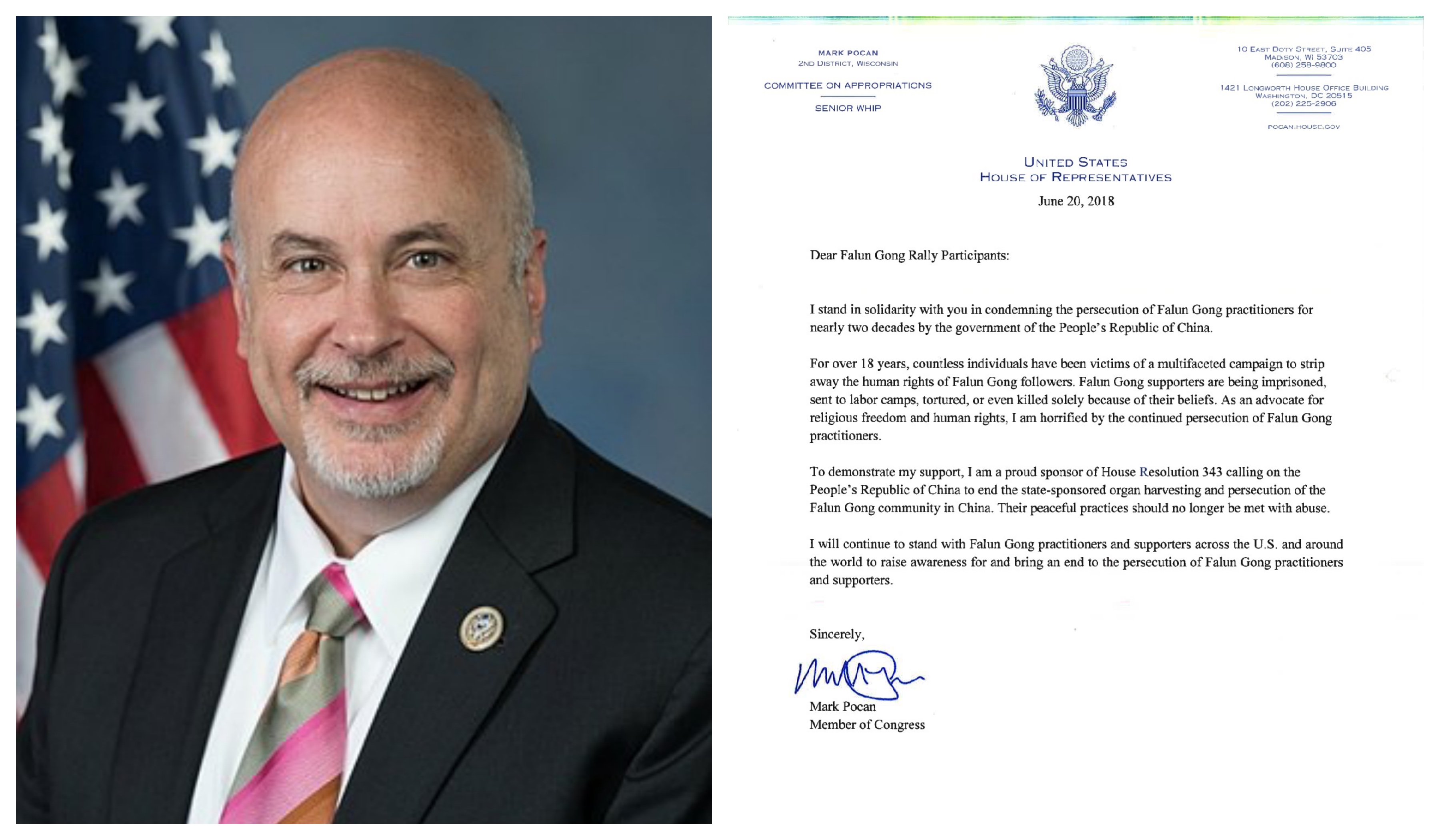 威斯康星州联邦众议员马克·波肯(Rep. Mark Pocan)在声援信中说:“我坚定地跟你们站在一起,谴责中共近二十年来对法轮功学员的迫害。