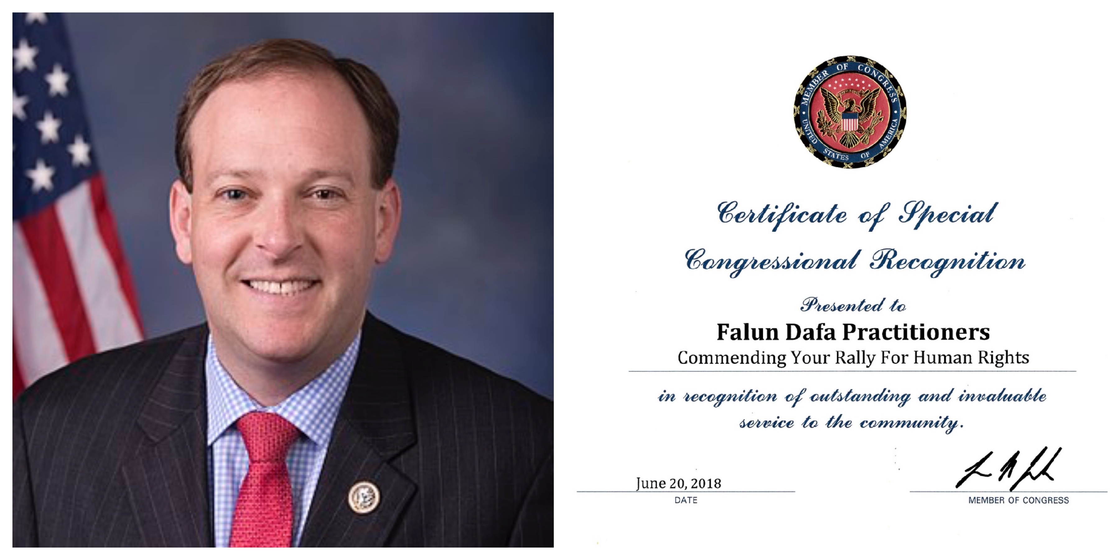 纽约州联邦众议员李·泽尔丁(Rep. Lee Zeldin)向法轮大法修炼者颁发国会特别褒奖证书,赞扬他们捍卫人权的集会,表彰法轮大法修炼者为社区提供的卓越而无价的服务。
