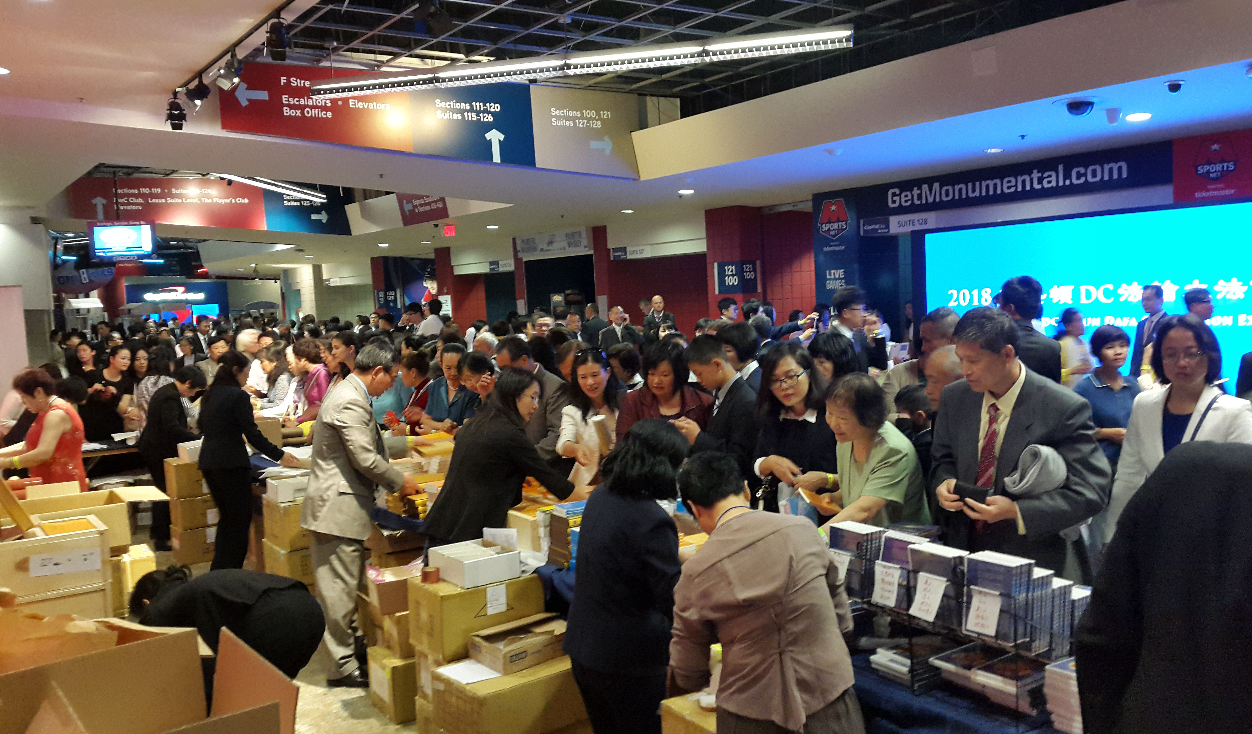 【明慧网二零一八年六月二十二日】(明慧记者章韵、华清华盛顿DC 报道)二零一八年六月二十一日,近万名来自世界各地的法轮功学员,在美国华盛顿DC的Capital One Arena ,举行了二零一八年美国华盛顿特区法轮大法修炼心得交流会。为了给大法修炼者以及渴望了解大法的人士提供大法书籍,纽约天梯书店(大法书籍专卖店)特地在会场里设立了摊位。法会中午休息期间以及法会结束后,天梯书店摊位前,挤满了购买大法书籍和录音录像的法轮功学员。他们中很多买了书的人都表示现在的民众都急迫需要大法书籍。