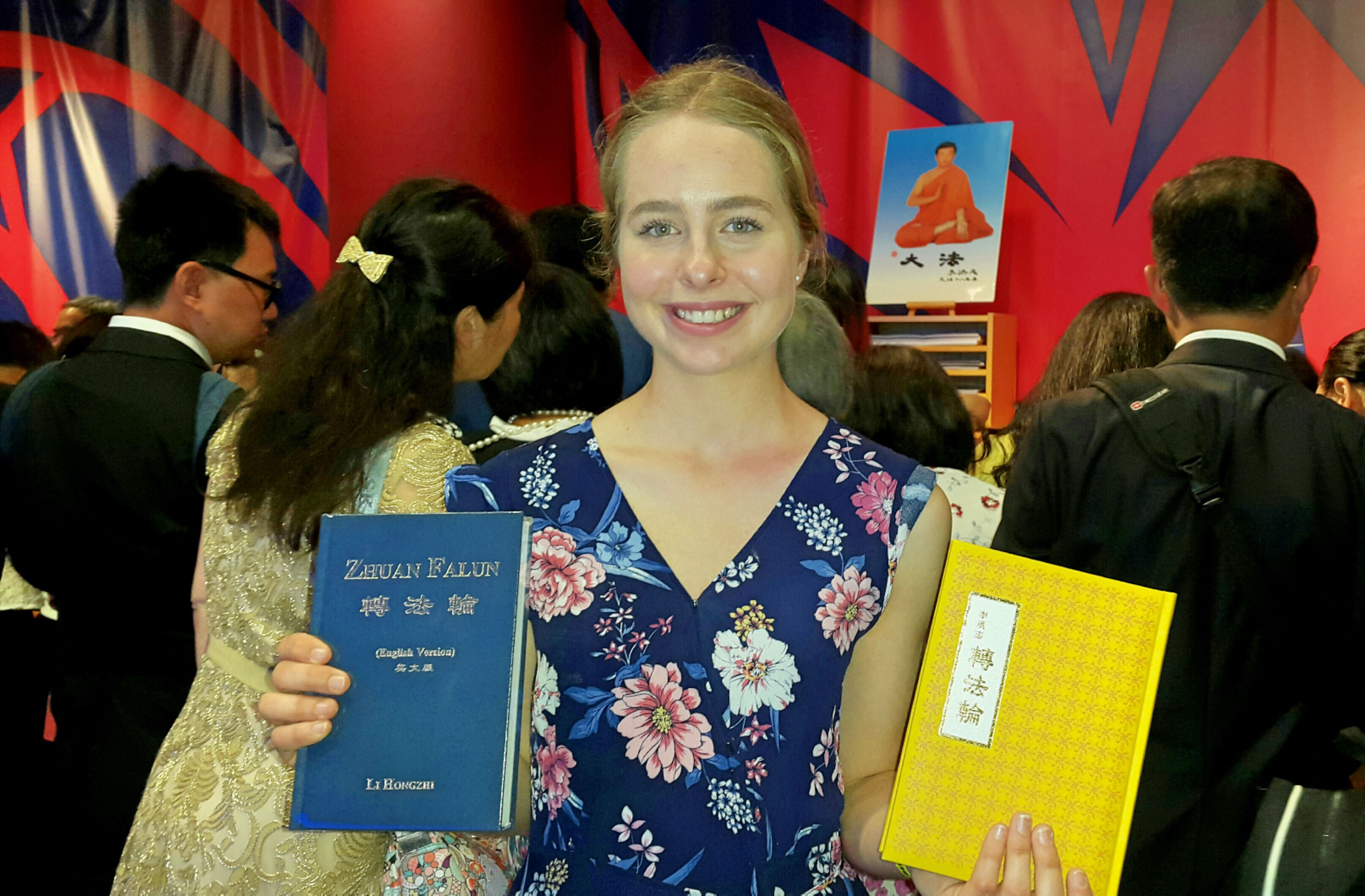 图5:从新西兰赶来的才修炼一年不到的新学员格雷斯·伊莎贝拉(Grace Isabella)女士购买了中文和英文《转法轮》。
