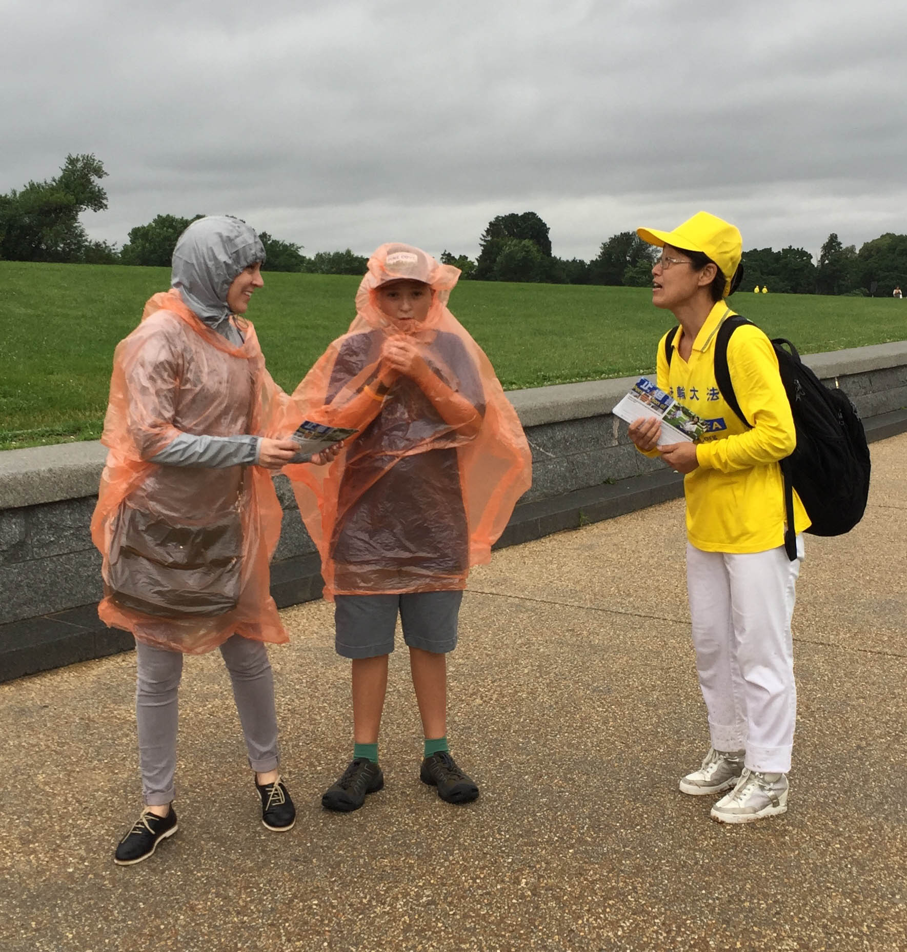 尽管当天下了几场大雨,并且在上午的天气预报预测晚八点到十点(活动预定时间)都会有雷雨,法轮功学员没有取消活动。虽然七点左右有几次阵雨,八点后并没有下雨,活动得以顺利进行。庄严肃穆的场景令路人动容,纷纷表示对法轮功学员的支持。