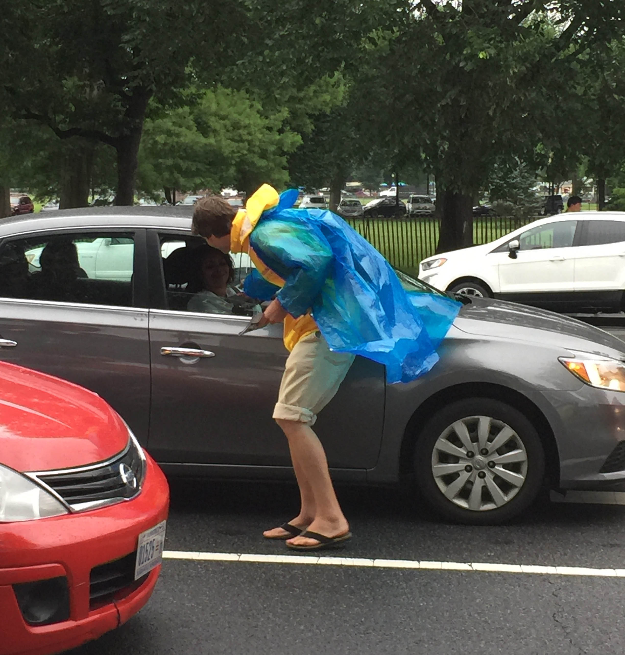 ![]() 一辆车打开车窗。司机向玛蒂尔斯招手。玛蒂尔斯为她提供传单。 |