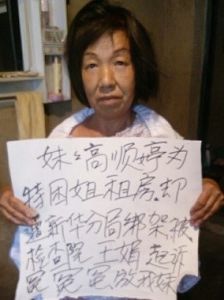 当日上午,高顺亭的姐姐高兰亭拄着拐费力地到达爱民区法院门口,穿上喊冤衣服,不久爱民区检察院公诉人王娟进了大院,高兰亭大喊:放了我妹妹,我妹妹没有罪,你这样做丧天良,会遭到恶报!我几次见你,你都这样对待我。王娟仓促往里边走……