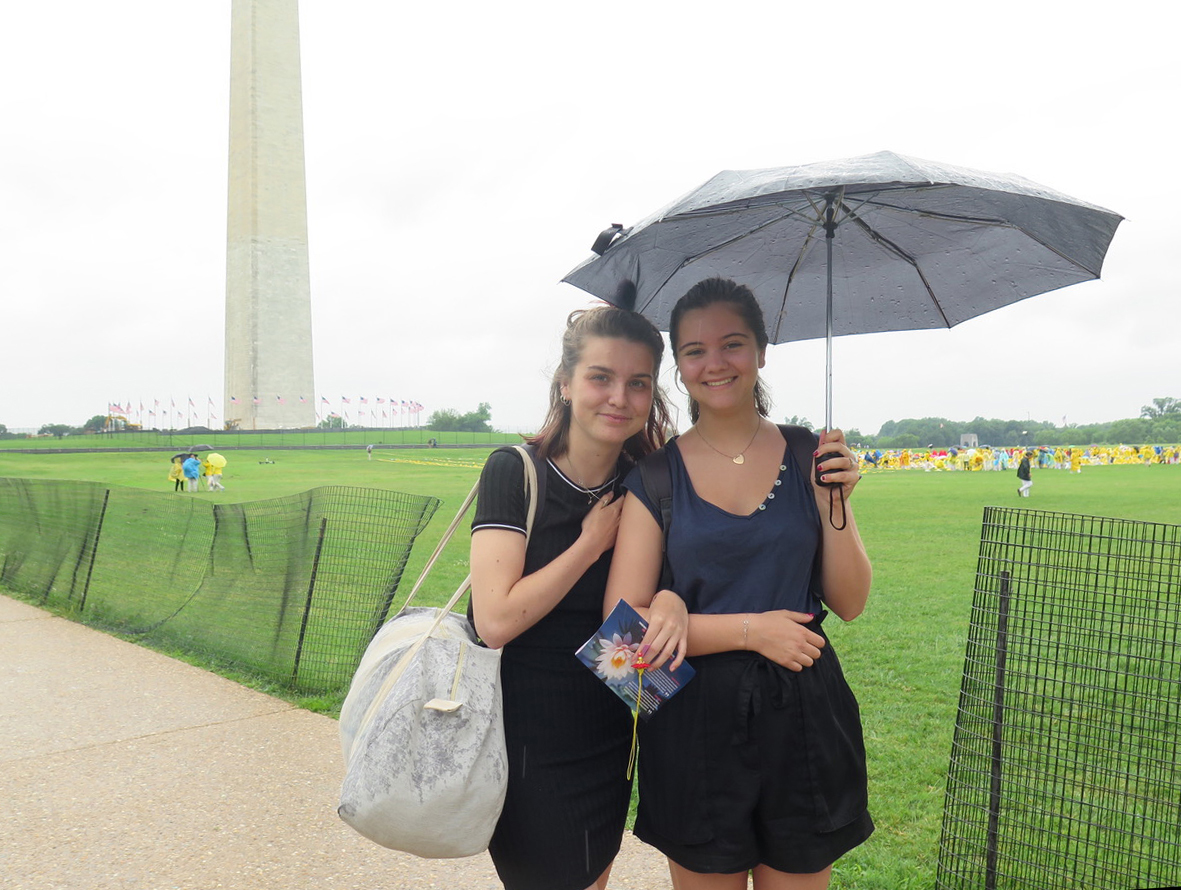 来自加拿大的莫妮卡(Monica)和来自佛罗里达的凯蒂(Kitty)结伴来华盛顿旅游。他们在下榻的酒店里看到有许多人穿着明亮的黄色T恤,当她们再一次在华盛顿纪念碑前,看到许多法轮功学员穿着同样的黄色T恤在炼功时,她们产生了兴趣,希望了解这些人在做什么。当他们了解到这是来自全球的法轮功学员在炼功,修炼法轮功的人是按照真善忍的原则来生活,同样的修炼人在中国正在遭受迫害时,两人表示,“你们在这里唤醒着民众、唤醒着政治家,这很好!”在为她们照相时,身着黄色雨衣的她们笑着说:“我们穿的是同样的颜色!”