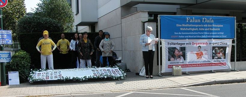 ![]() 图3:法轮功学员席费尔(Schiffer)女士在中领馆前朗读了公开信 |