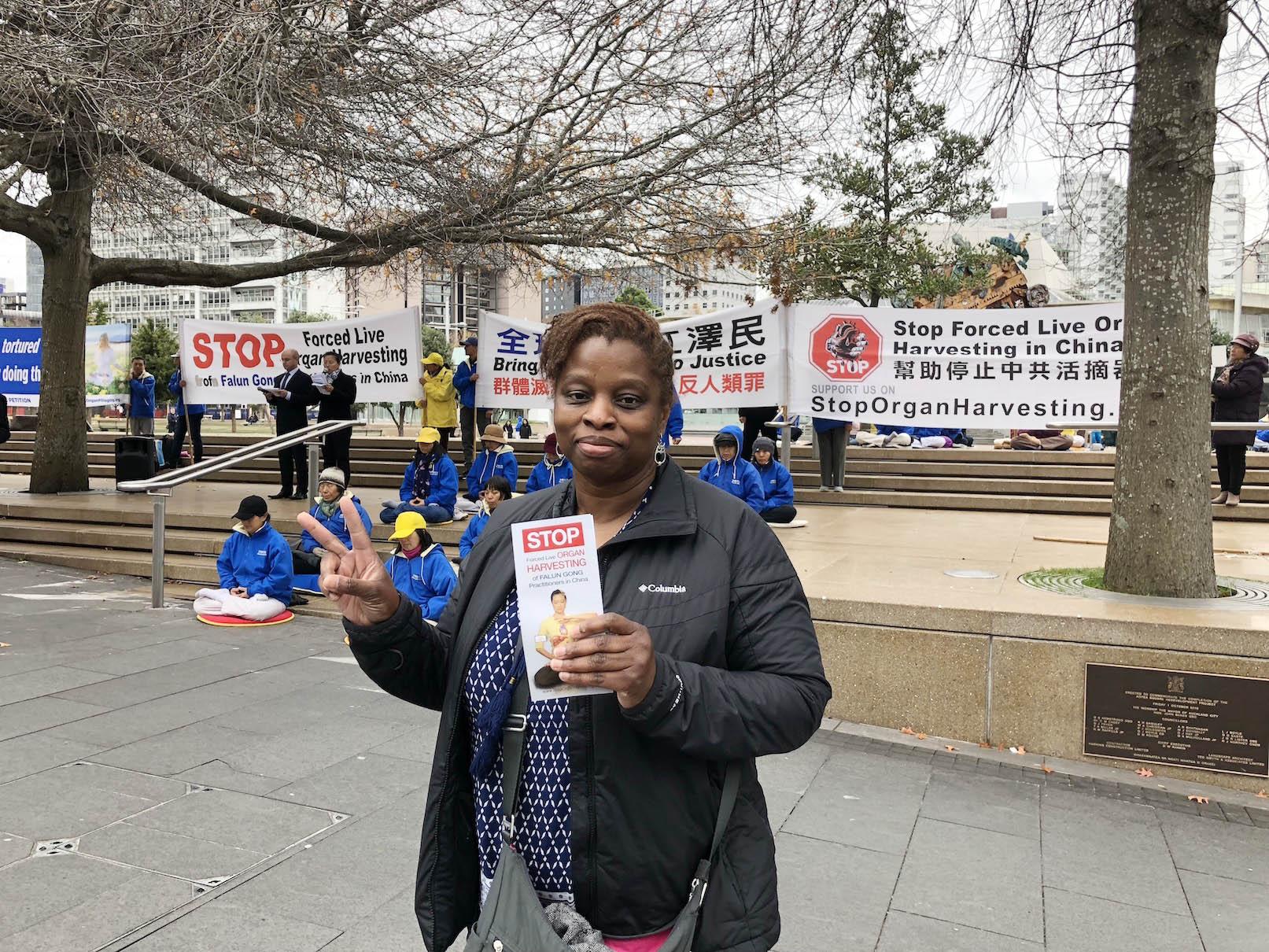 纳蒂娜·哈里斯(Natina Harris)来自美国,她看过关于器官贩卖的纪录片,所以她相信这是真实存在的。她表示:“希望人们都来支持法轮功,来了解在中国发生的故事,因为这个残酷的事实让人很担忧,如果我们漠视不人道的事发生在人类社会,那是不正义的。而如果我们都支持正义的,那么他们(中共)就会停止迫害。我们共同居住在这个星球,我们要互相关心,互相帮助。她希望美国政府和新西兰政府都应该来关注中国人权问题,并为之(改善人权)做出努力。”