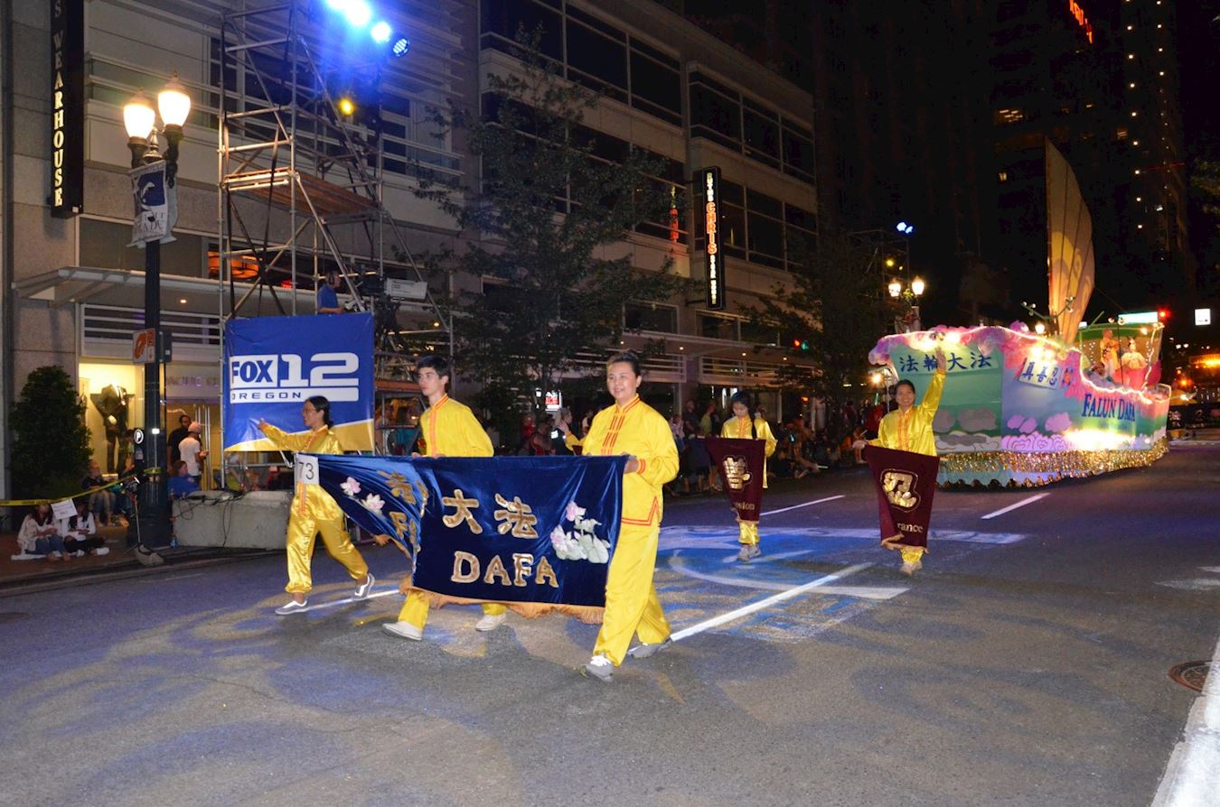 ![]() 图1~2:法轮功学员参加俄勒冈州波特兰市举行的第四十二届玫瑰花节星光游行,并获得游行的最高奖项——“最佳照明奖(Sweepstakes-Best Illumination)”。 |