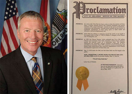 - 美国佛罗里达州奥兰多市褒奖法轮大法(图)- 美国佛罗里达州奥兰多市市长巴迪·代尔(Buddy Dyer)颁发褒奖法轮大法弘传世界二十六周年,并宣布二零一八年五月十三日为奥兰多市“法轮大法日”。