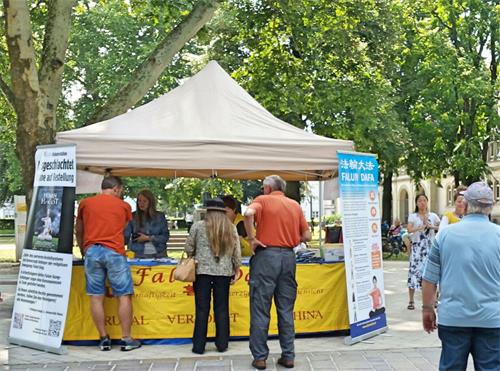 ![]() 图1~4:二零一八年七月七日,德国法轮功学员在西南边陲Lörrach市举办了传播法轮功真相信息日。不少民众驻足了解真相,签名支持制止活摘。 |