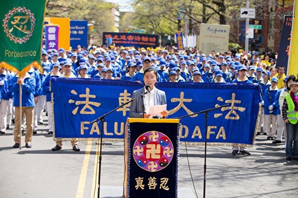 图: 2017年4月25日张鸿玉在纽约法轮功学员集会上讲述母亲修金秋被酷刑迫害致死的经历。