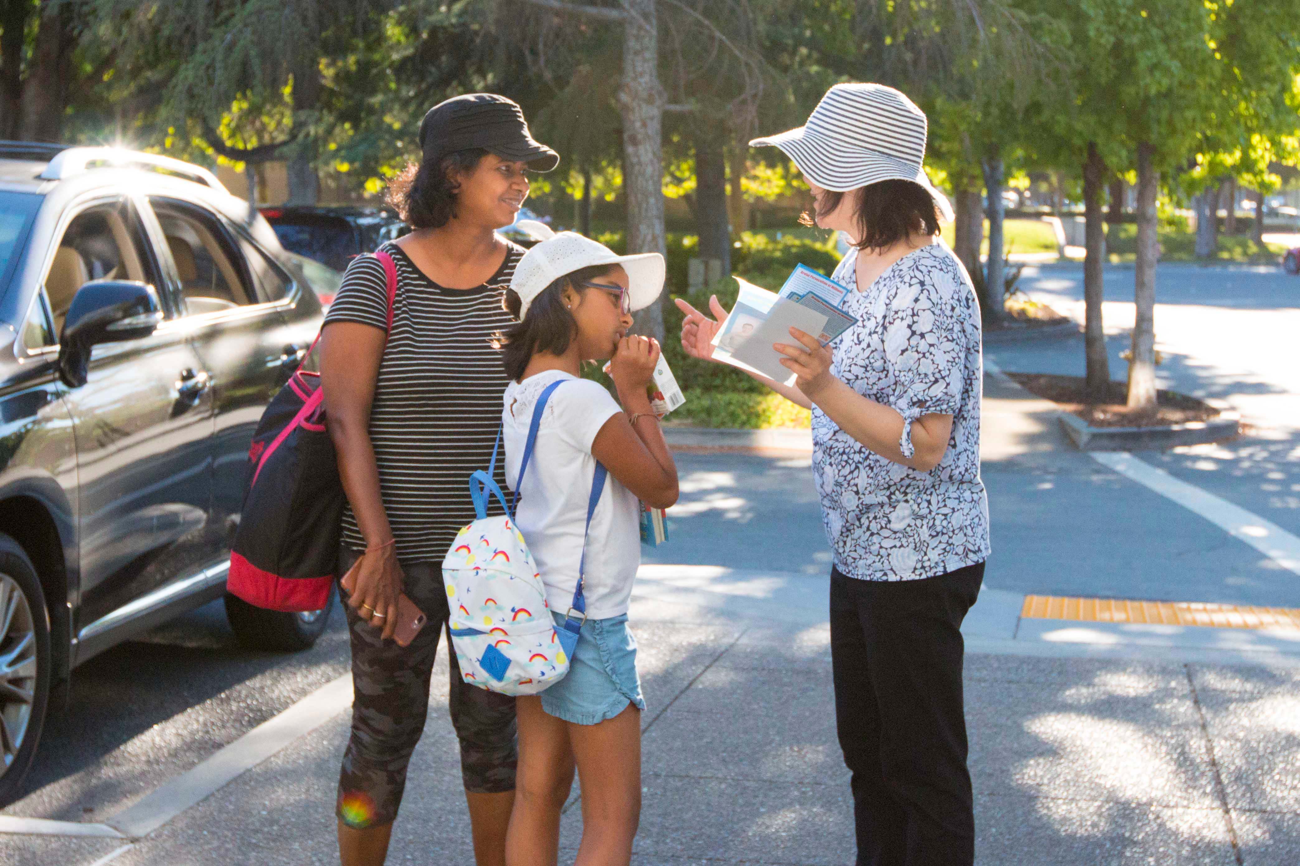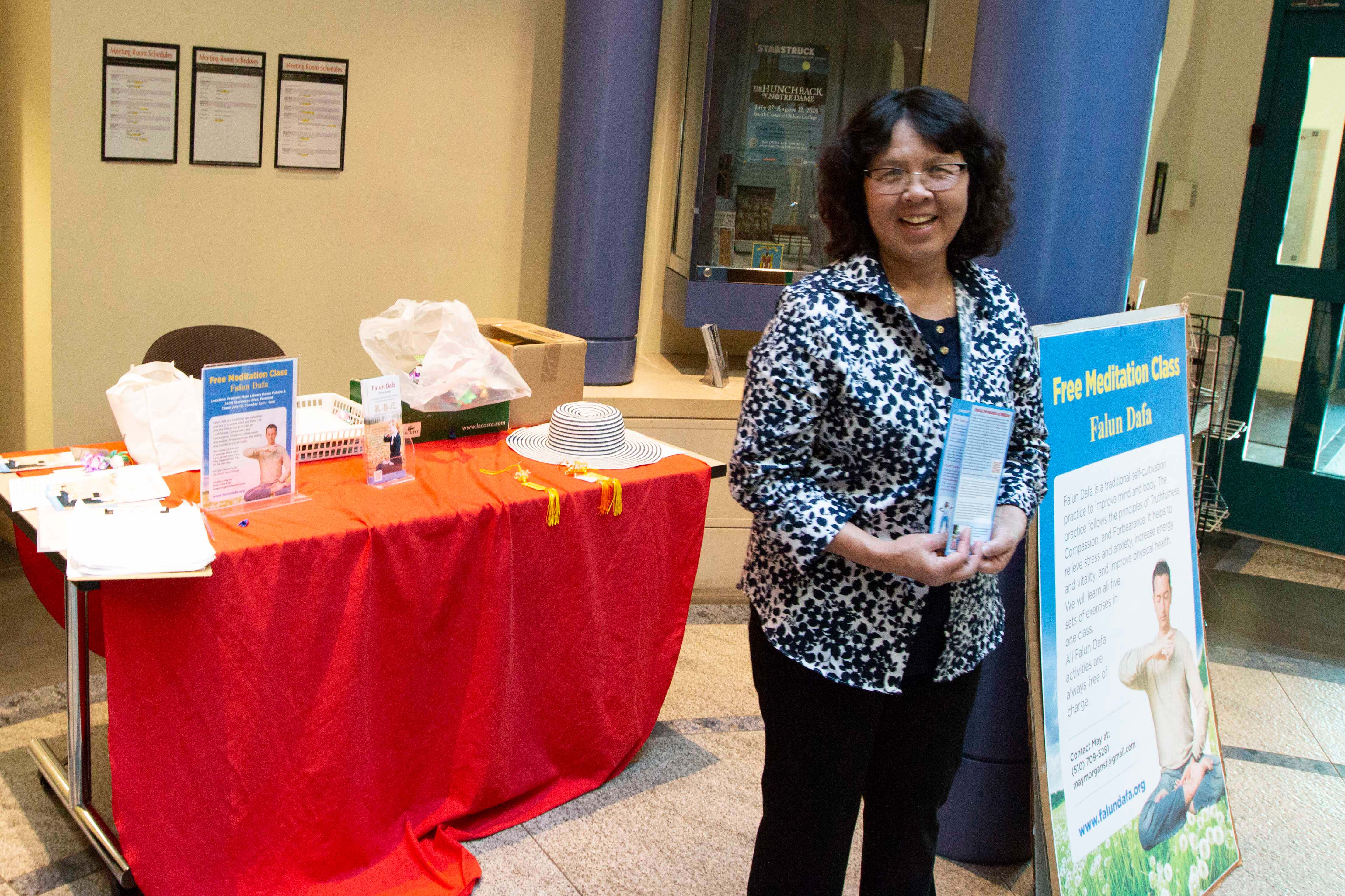 法轮功学员梅(May)介绍说,前几天我们就在图书馆派发教功班的传单,今天带来的传单很快就发光了。