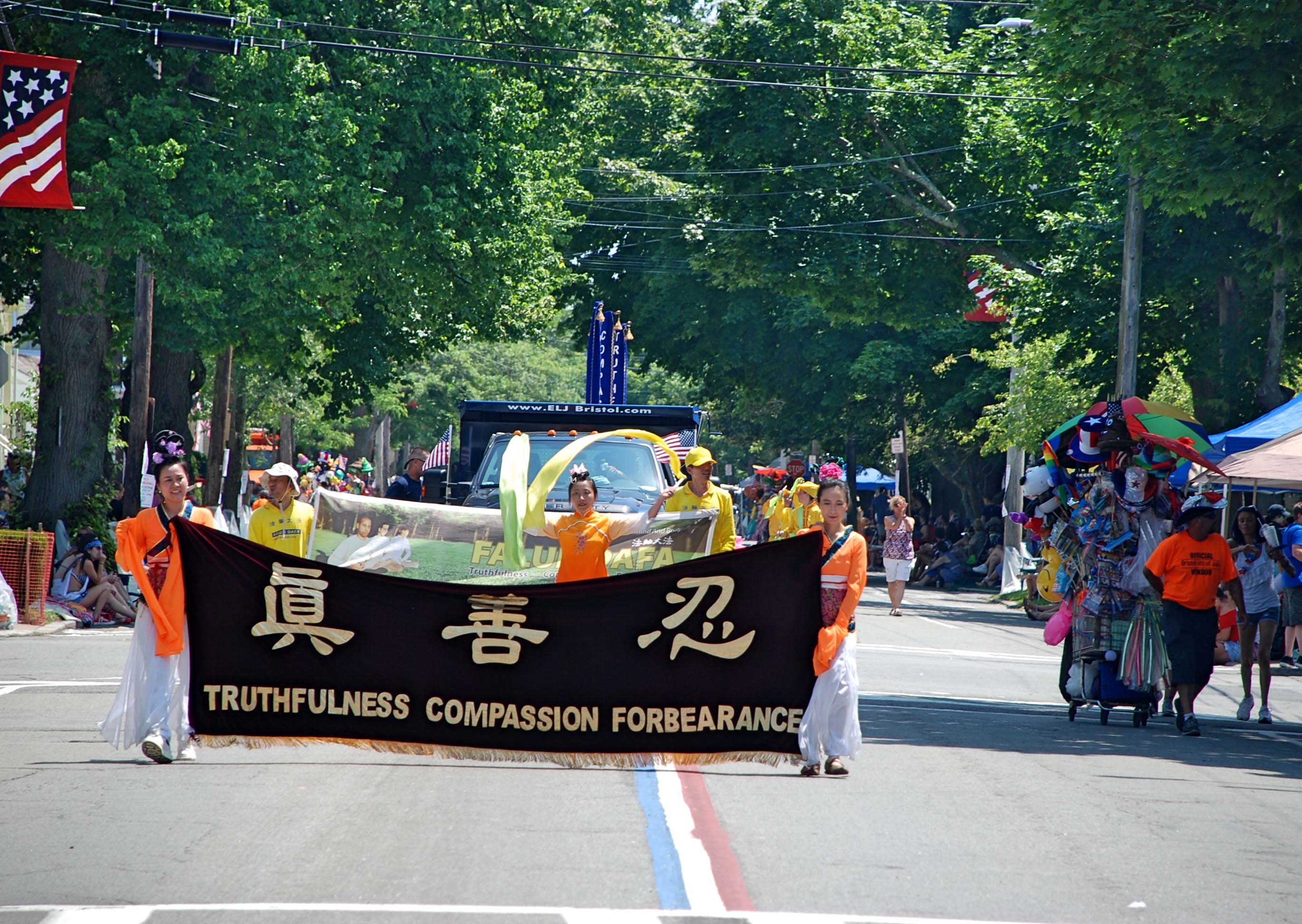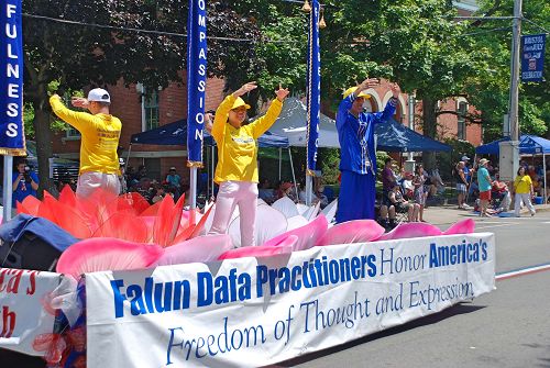 法轮功学员的游行队伍给民众耳目一新的感觉。走在最前面的是仙女队,她们打着“真、善、忍”的横幅。随后是大莲花花瓣围绕着竖型条幅英文“真、善、忍”横幅,在花车上的学员演示动作“缓、慢、圆”的功法。法轮功学员的花车获得了该游行的“最美花车”奖。