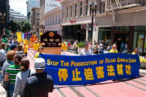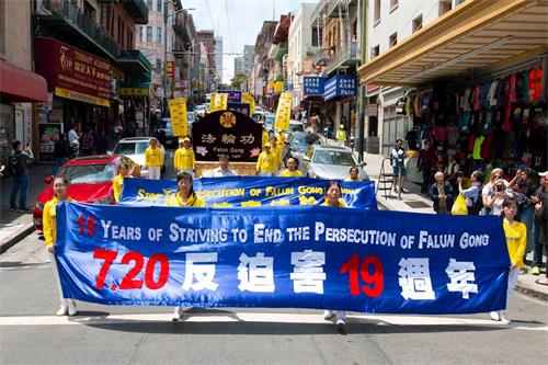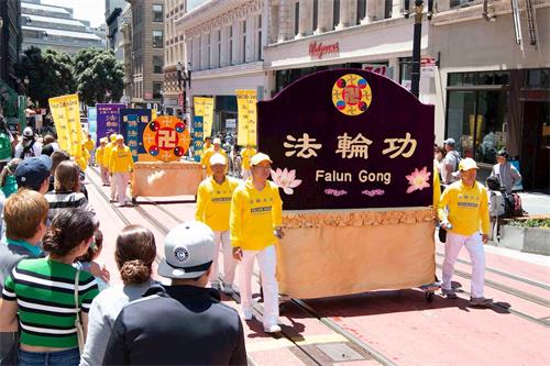 中午十二点由气势磅礴的天国乐团演奏雄壮的乐曲领队,法轮功学员游行队伍开始从旧金山市政厅广场出发,经过主要大道市场街,再经过联合广场,环绕中国城后结束。