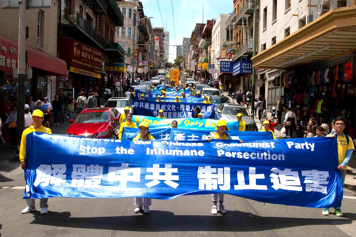 从加拿大来的梅乐蒂(Melody)在中国城看到法轮功游行队伍时,和朋友一起驻足观看。她说,“以前没有听过法轮功,但是看到他们是以一种非常和平的方式告诉人们因为不放弃信仰而在中国受迫害,这让我感到佩服。”
