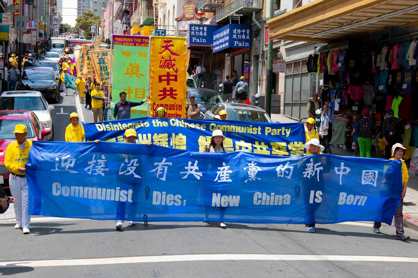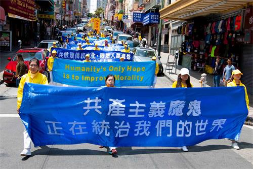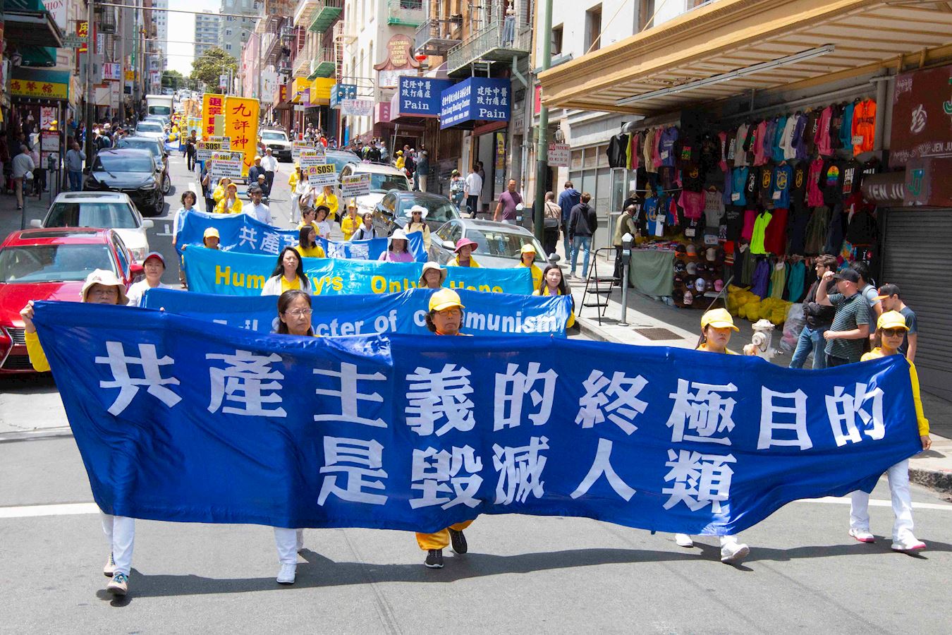 游行队伍由四个方阵组成:第一方阵是法轮大法好,由美西天国乐团、橫幅队和炼功队组成;第二方阵是停止迫害法轮功。由身穿白色服装的学员手持被迫害致死同修的遗像,和要求制止中共法西斯暴行等横幅队组成;第三方阵是全球起诉江泽民。法轮功学员举着展板向人们展示江泽民的罪行。第四方阵是《九评》、退党、讲真相方阵。他们举着声援三亿九百万中国人三退的横幅和展板,呼吁民众赶快退出中共的邪恶组织。