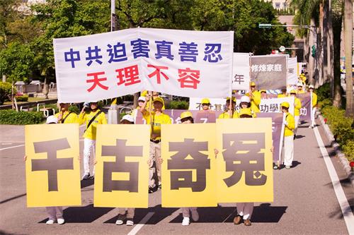 下午三点三十分由气势磅礡的天国乐团演奏雄壮的乐曲领队,法轮功学员游行队伍开始出发,后面有“大法洪传”,“千古奇冤”,“结束迫害”等整齐的队伍,行经台北市政府及各大学等文教区域,穿越台北最繁荣的信义商圈与东区街头,终点抵达台北市政府市民广场,全程共四点二公里。