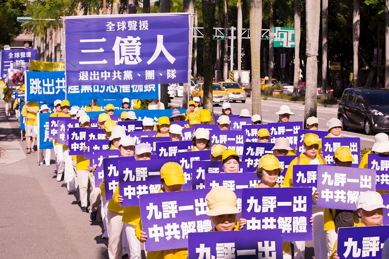 游行队伍出发前,有一团来自吉林的旅游团,虽然已到自由的台湾,仍然感受到他们在一言堂谎言下被桎梏已久的思想。他们看到游行队伍有“法轮功”的字样非常惊吓与害怕,不明真相的导游赶着他们绕道走,不让陆客接受法轮功学员赠送的真相资料,但是仍有陆客大方的在游行队伍出发前的地方,以“解体中共,制止迫害”真相展板为背景拍照。