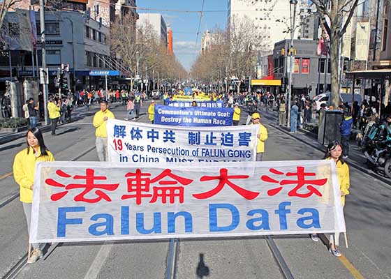 7月14日,法轮功反迫害19周年之际,部份墨尔本法轮功学员在市中心举行了游行和集会。封路大游行穿越最繁华的商业步行街和唐人街,震撼人心。
