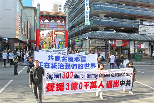 游行队伍中有洁白肃穆的悼念队伍,纪念十九年来被中共迫害致死的法轮功学员;还有花车、和祥和的功法展示;有唤醒精神觉醒的横幅队伍;压轴的是腰鼓表演,庆祝三亿人三退。法轮功学员在队伍中展现的美好、祥和和理性,吸引各族裔游客和市民在街道两旁驻足观看、很多民众用手机拍摄照片、视频,人们主动向法轮功学员索取资料。