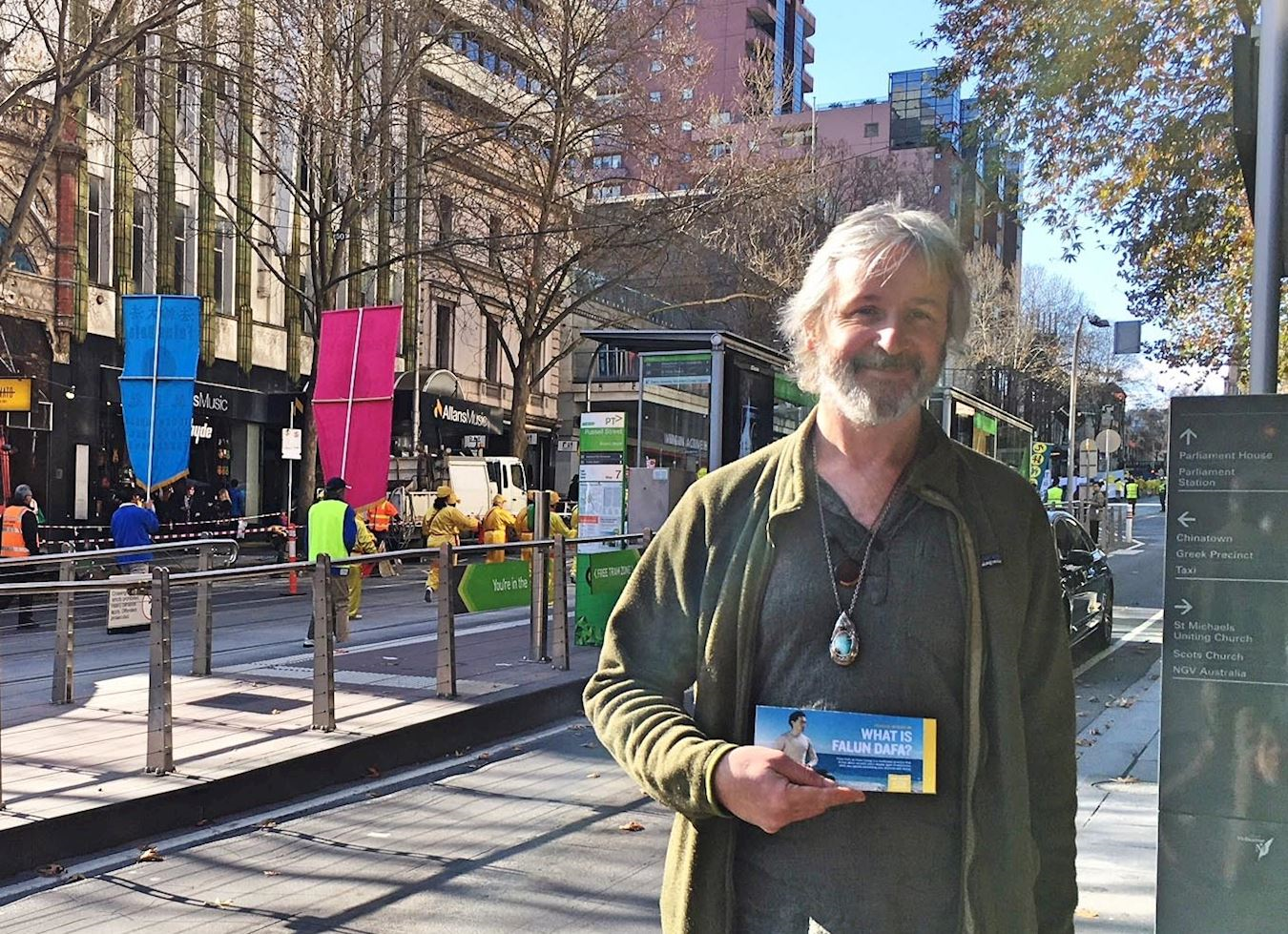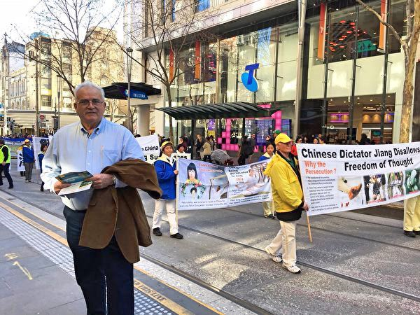 【明慧网二零一八年七月十七日】(明慧记者夏纯清澳洲墨尔本报道)“法轮功学员十九年来的遭遇,和希特勒对待犹太人的方式没什么两样。人们在失去生命,这是群体灭绝。”药品销售代表吉姆·豪(Jim Haw)在墨尔本市中心观看了法轮功反迫害十九周年的游行后哽咽着说道,得知中国大陆大法弟子因为坚守信仰而遭受中共非人的迫害,他难掩悲愤的泪水。