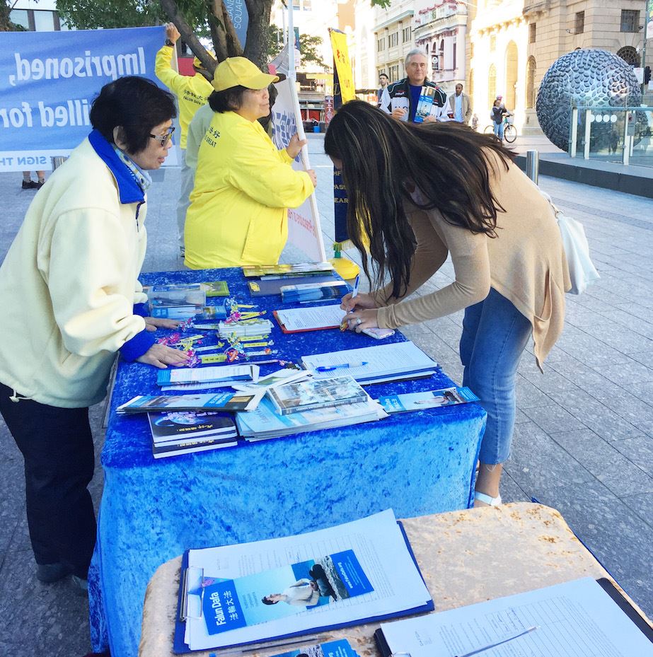 布里斯本广场是近年来学员讲真相、揭露中共迫害法轮功罪行的主要场所之一,行人中有不少人已经了解了迫害真相,对迫害仍在继续表示愤慨。也有一些人是初次听说法轮功,当他们得知千百万无辜民众因信仰“真、善、忍”遭到中共邪党长达十九年的迫害后感到非常震惊,纷纷在征签簿上签名,支持法轮功学员的和平抗争。
