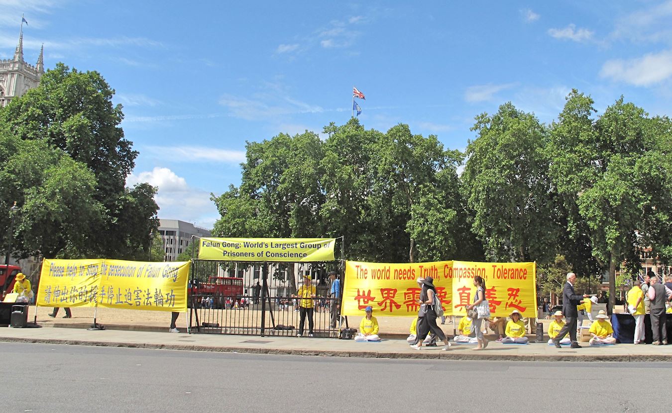 这是明慧网发表的二零一七年七月十八日法轮功学员在英议会大厦前举行活动的场景描述。一年后,二零一八年七月十七日,这个场景再次展现在英议会大厦前。时间在走,行人脚步依旧匆匆,又有很多人在英国议会大厦前看到了法轮功、听闻法轮功反迫害真相。