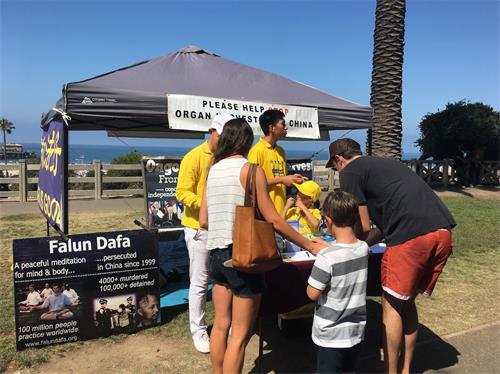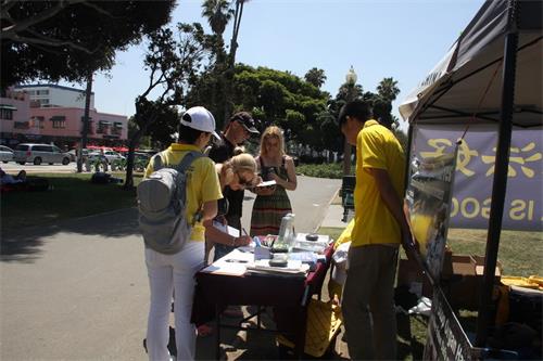 集会现场引起很多游客的关注。他(她)们在呼吁制止活摘的征签表上签名,驻足阅读真相展板,与学员交谈询问问题。
