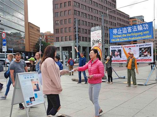 '图1~3:六月二十三日法轮功学员在柏林波兹坦广场(?Potsdamer?Platz)?上向游客讲真相。'