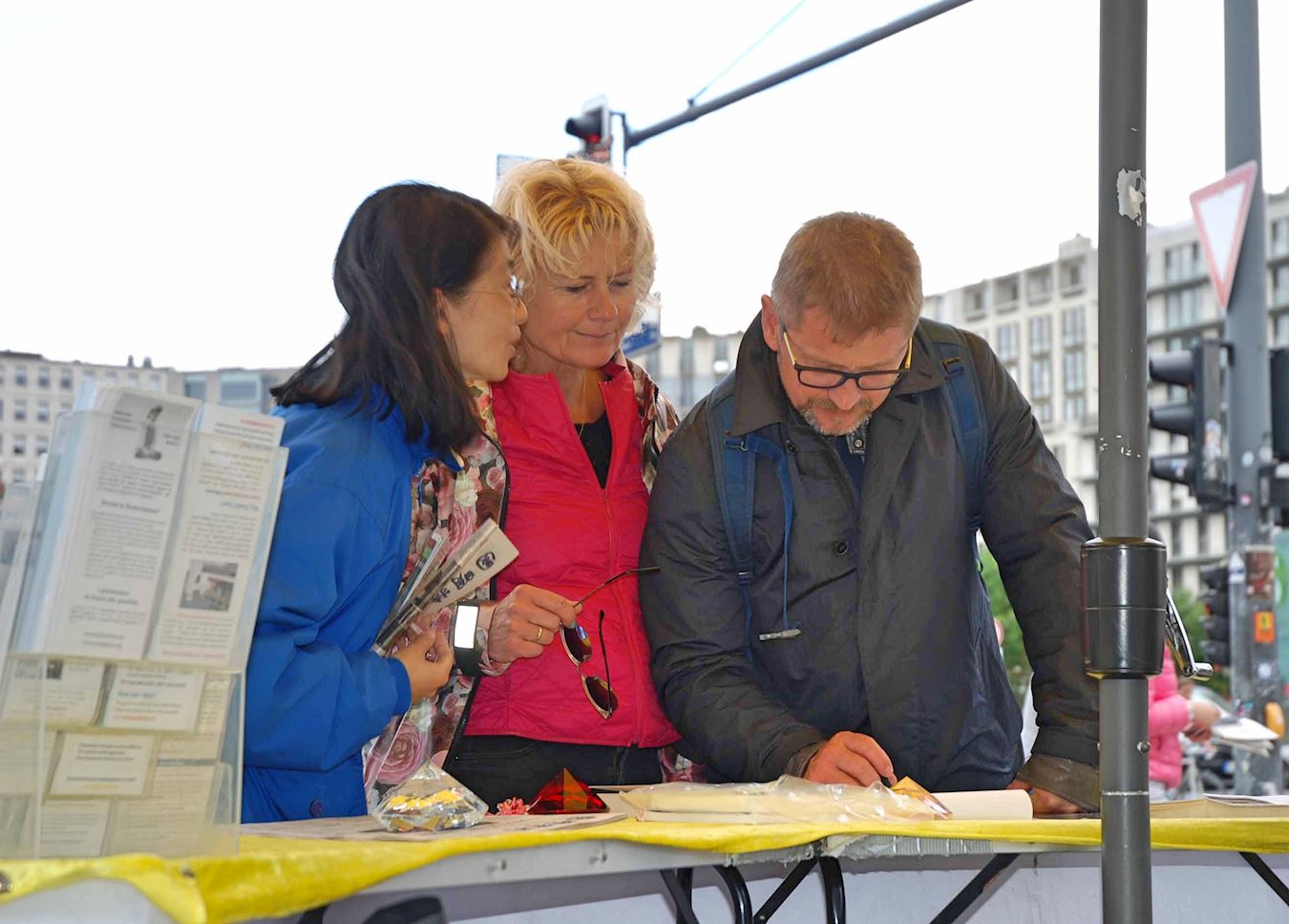 图4:一对来自瑞典的游客在征签簿上签字支持反迫害