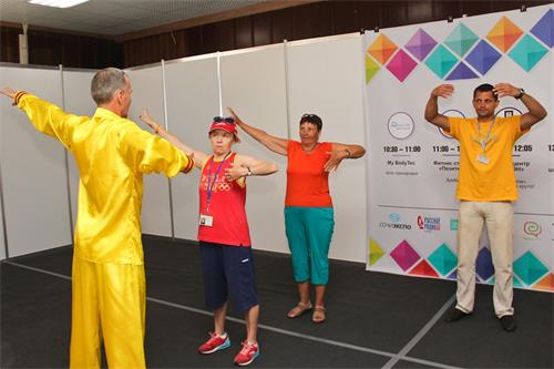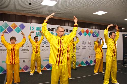 '图1~2:俄罗斯法轮功学员在“今日和明日的医学——健康生活方式展”上演示法轮功功法。'