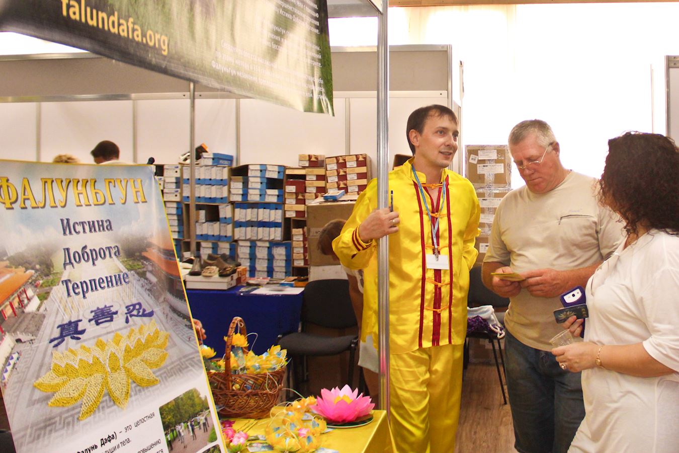 图3:俄罗斯法轮功学员应邀参加“今日和明日的医学——健康生活方式展”,向人们介绍法轮功。