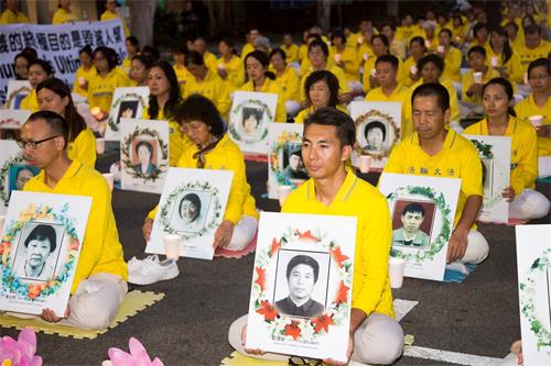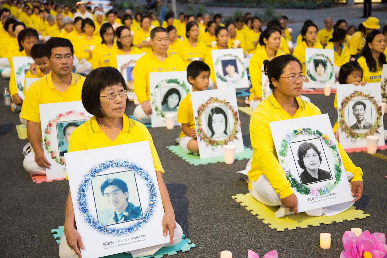 当晚夜幕降临,炎热被晚风驱散,法轮功学员们手捧遗像和蜡烛,静坐缅怀被中共迫害致死的法轮功修炼者,并以此和平方式呼吁世人秉持善念、坚持正义良知,共同制止中共对法轮功长达十九年的迫害,法办迫害元凶江泽民。