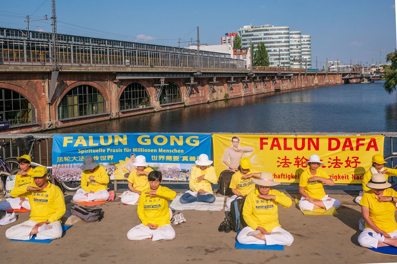 ![]() 图1~5:反迫害十九周年,法轮功学员在柏林中使馆对面的亚诺维兹桥(Jannowitz Bridge)上集体炼功,传播法轮功的真相。 |