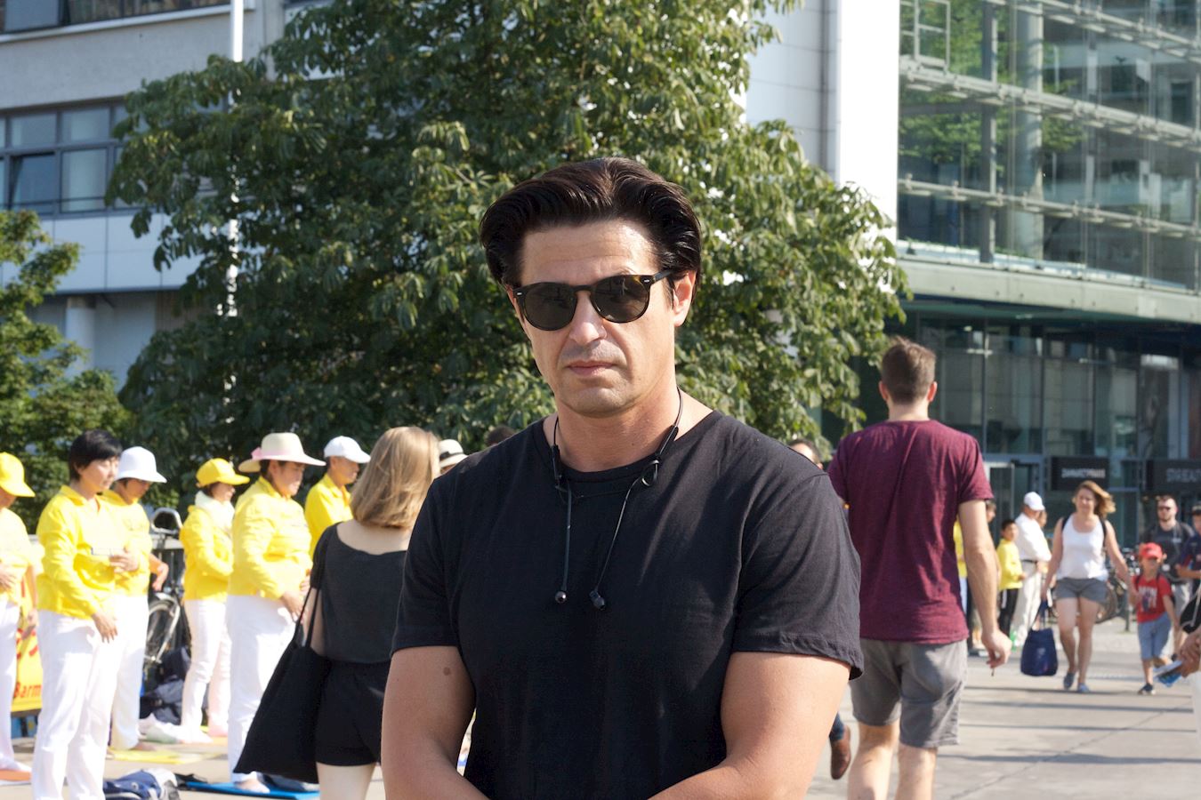 柏林的电影导演兼演员弗拉基米尔·维拉诺夫(Vladimir Vilanov)看到这么多法轮功学员在使馆前炼功,感到很震撼,拿出手机不停地拍摄对着学员炼功的场景,说:“这能唤醒更多的人。”
