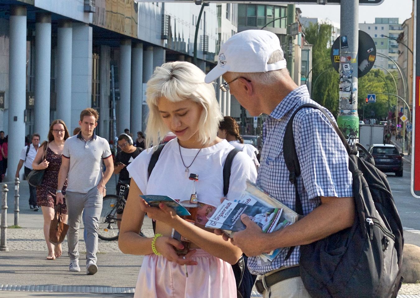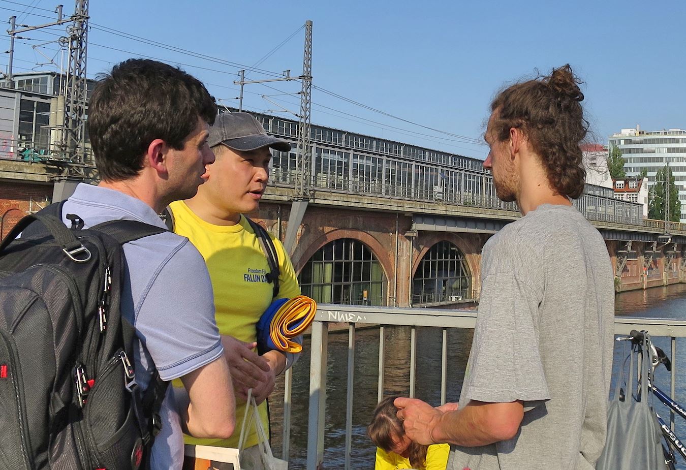 在德国中使馆前,每天有大量的中国游客来作短暂停留,亚历克斯说:“他们并不是所有人都愿意接受资料,可他们总停留在我们的周围,观看横幅,观察我们的行为举止。有些人离开的时候,面带笑容,我觉他们认为我们很亲切。”