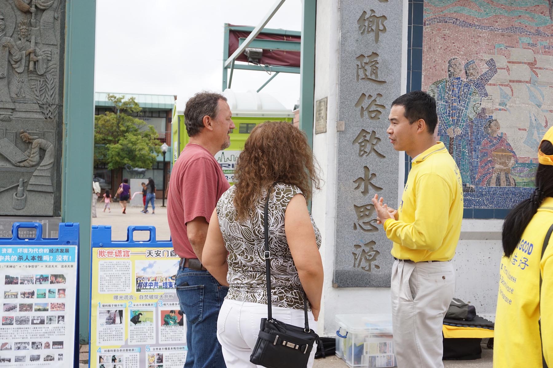 印第安纳州圣玛丽学院的政治系主任贝兰杰(Marc Belanger)也被游行吸引住了。他和太太带着几名学生到中国城用餐。当看到法轮功游行队伍路过,他驻足向学生们解释起来。