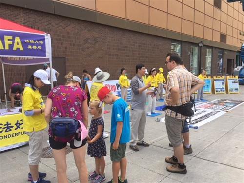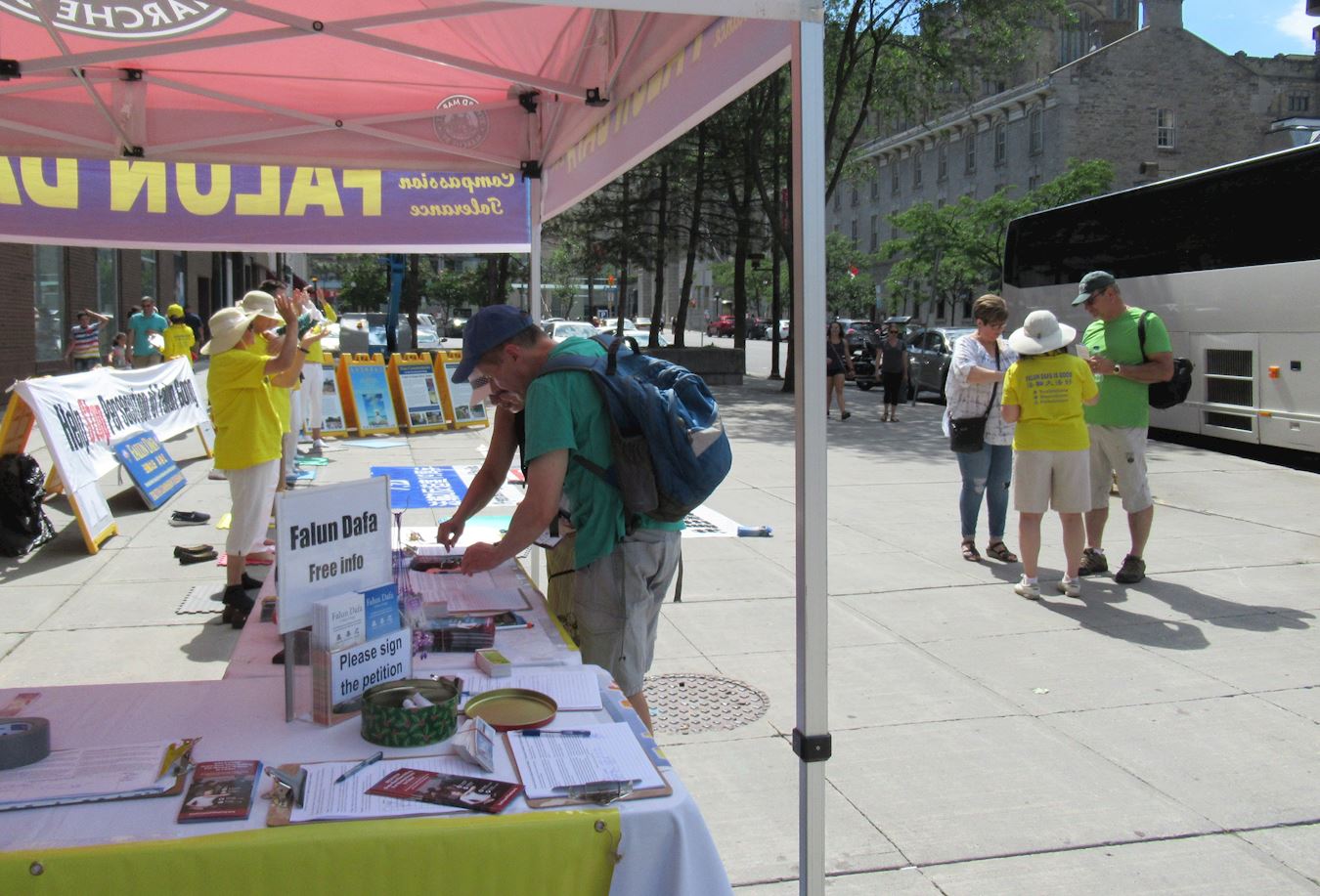 当天的活动,在摄氏三十一度,地表温度三十五度的高温下,渥太华部份法轮功学员祥和宁静的炼功场面吸引了许多了加拿大首都民众,他们了解真相后,纷纷在制止活摘的请愿信上签名,善良加拿大人也通过签名的方式,支持加拿大政府帮助营救被非法关押的加拿大公民孙茜。一位渥太华市民为法轮功学员的精神感动,特意为现场的法轮功学员每人买了一瓶矿泉水送来,以示支持。