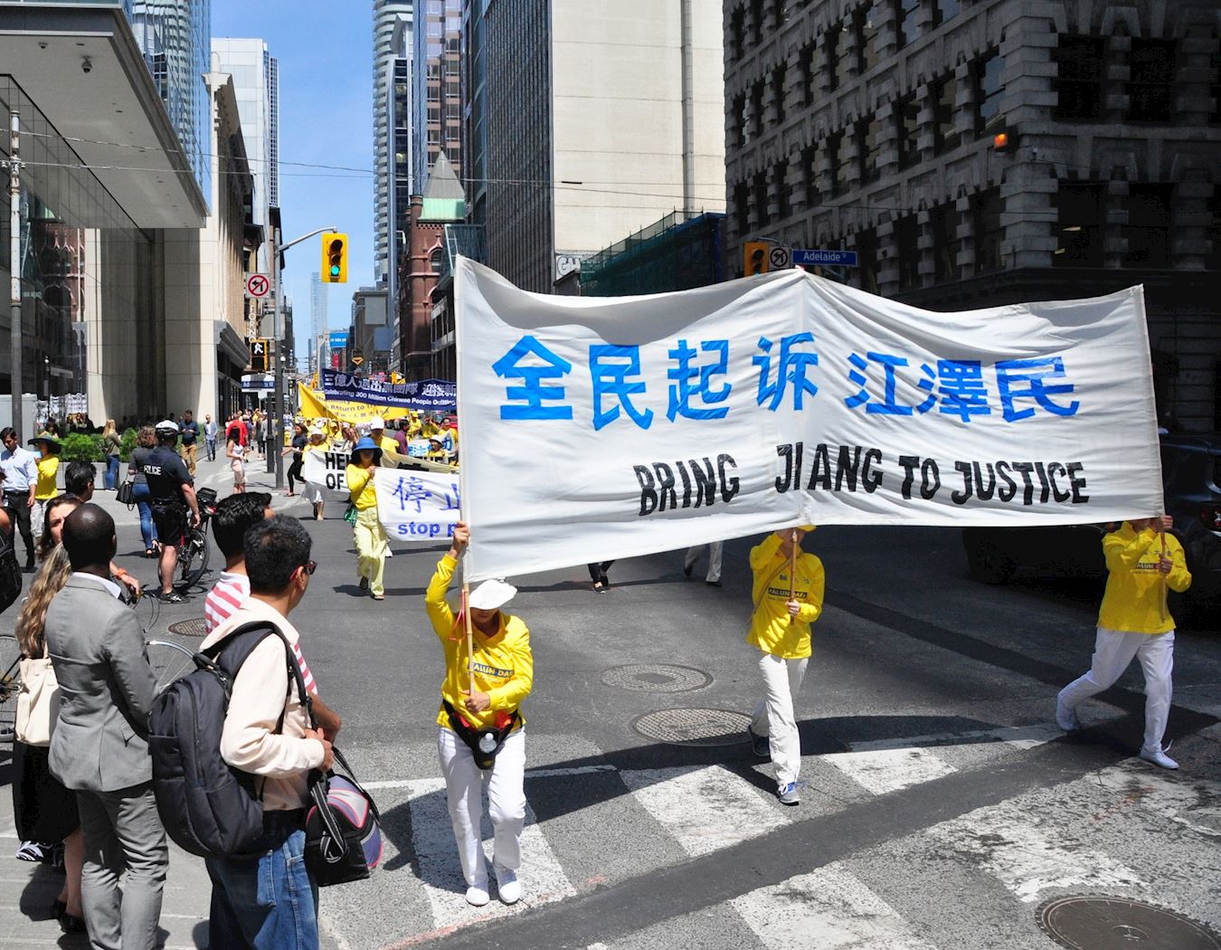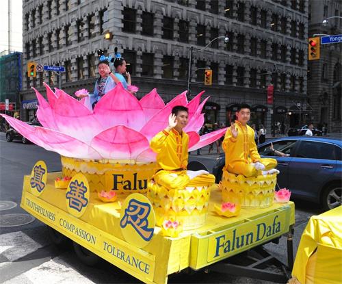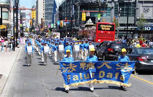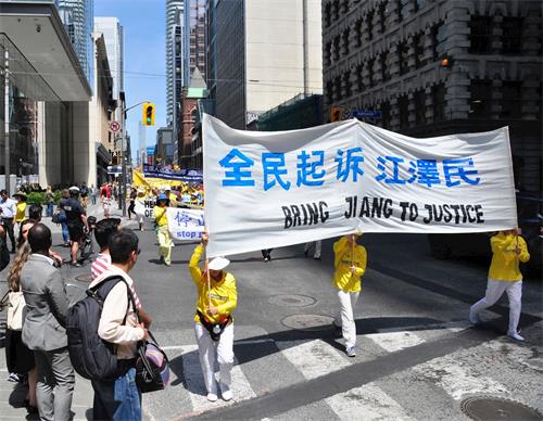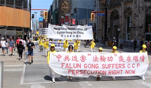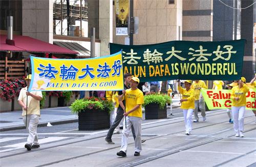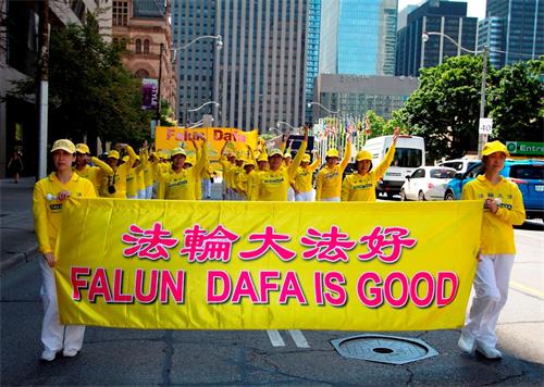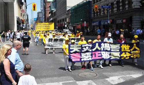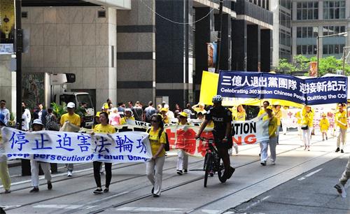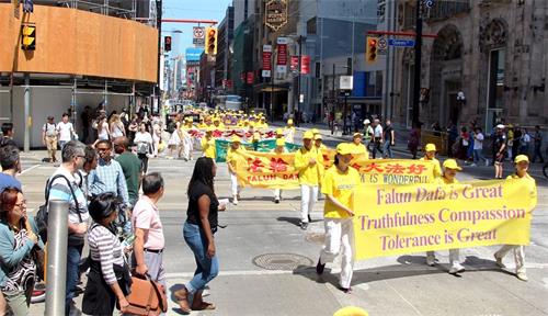 当天中午十二点,游行队伍从市政府广场出发,在多伦多商业大楼林立的金融中心行进,正值午餐时间,街道上有很多上班族和过往行人,看到游行队伍经过,他们纷纷拿出手机拍照和录像。有观众感慨为什么这么好的一个团体会被迫害这么长时间?!有观众流着泪说我不知道法轮功学员是怎么样面对如此残酷的迫害,我真想帮他们。第一次知道法轮功信息的观众感谢游行给他们带来了这个真相;做了三退的华人感谢法轮功。