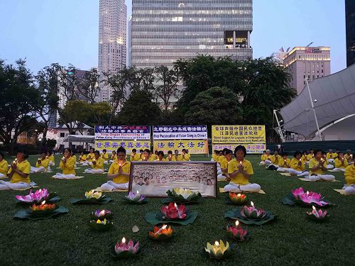 二零一八年七月十七日下午,在七二零反迫害十九周年之际,新加坡法轮功学员举办了讲真相活动。当夜幕低垂时,学员们点亮盏盏烛光,悼念在中国大陆因坚守正信被迫害致死的法轮功学员。