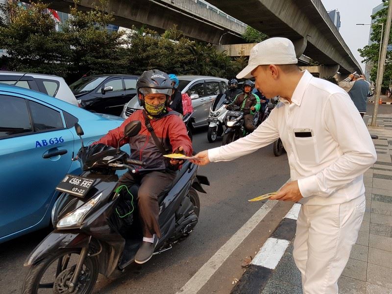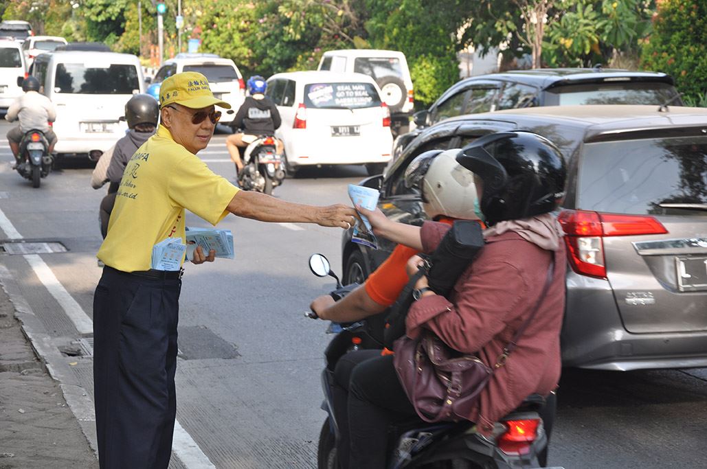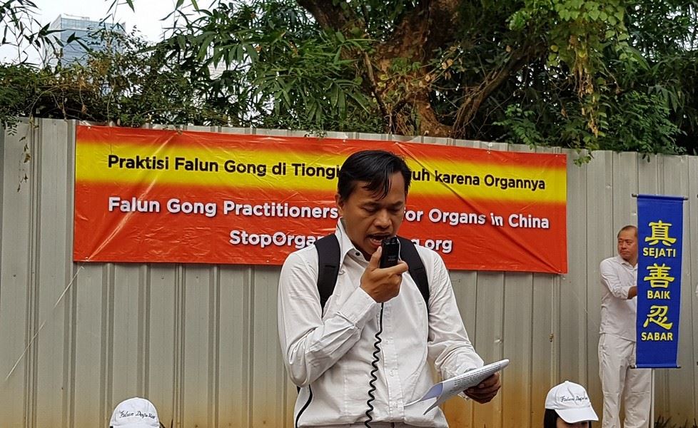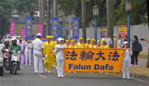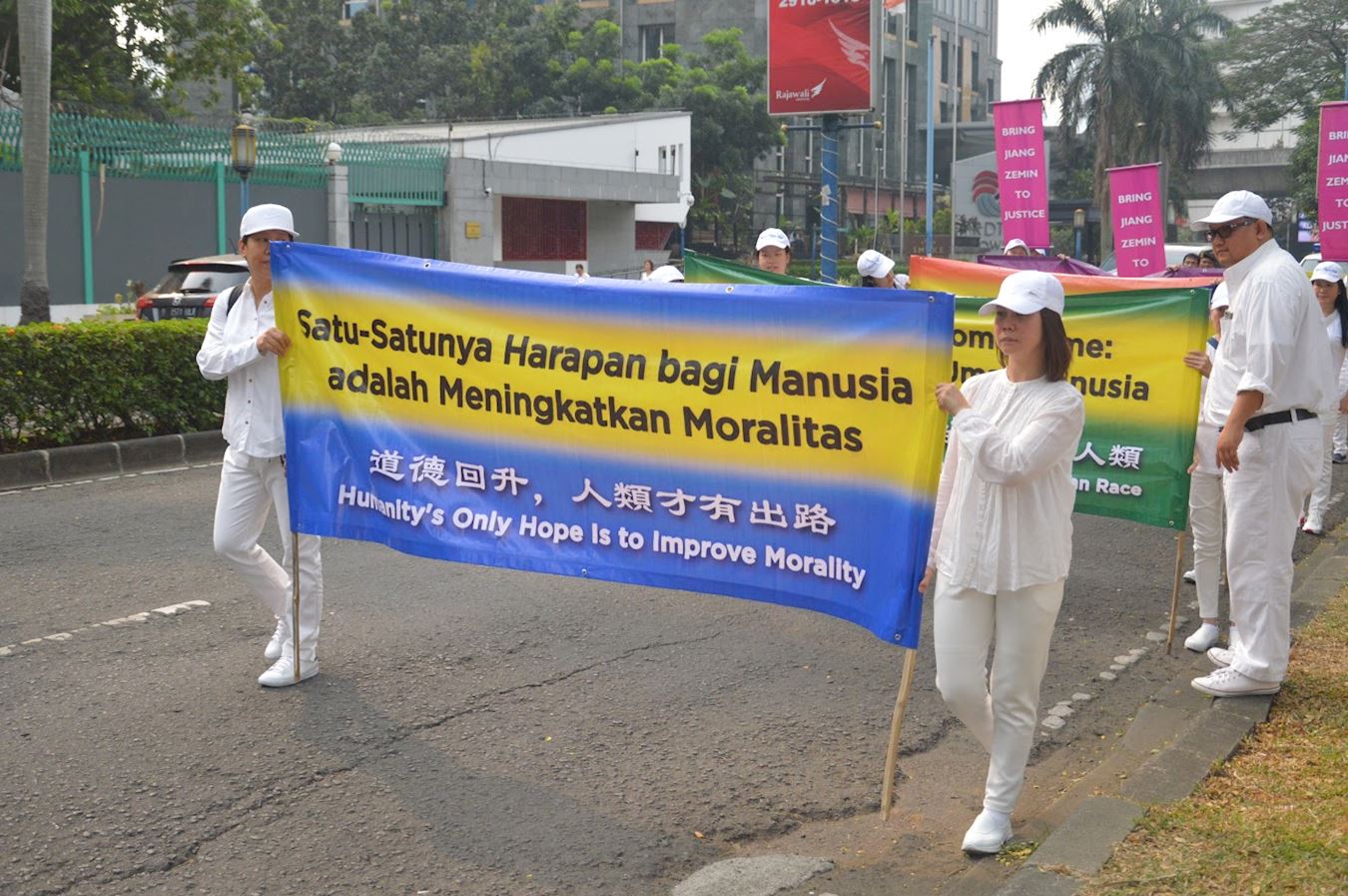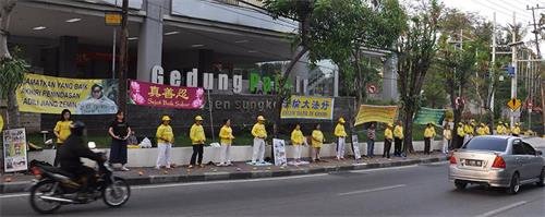 游行是由腰鼓队领队,接着是反迫害横幅、中共活体摘取法轮功学员器官的行动剧的队伍等,吸引了不少都市人的目光。很多过往坐在车上的人也纷纷降低车速看着表演,并拿了法轮功学员发的真相传单及自制莲花。游行结束后,雅加达法轮功学员在大使馆前和平地展开了反迫害横幅。