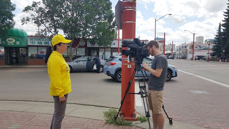 当天的集会上,埃德蒙顿法轮大法学会负责人刘女士接受了环球电视台(Global TV)记者的采访。她表示,尽管过去十九年里,中共的仇恨宣传欺骗了无数的中国民众,但法轮功学员秉持着“真、善、忍”的处世原则,坚持不懈地讲清真相,让越来越多的民众良知觉醒,认清了中共的谎言,越来越多的人们在以不同的方式支持法轮功学员。