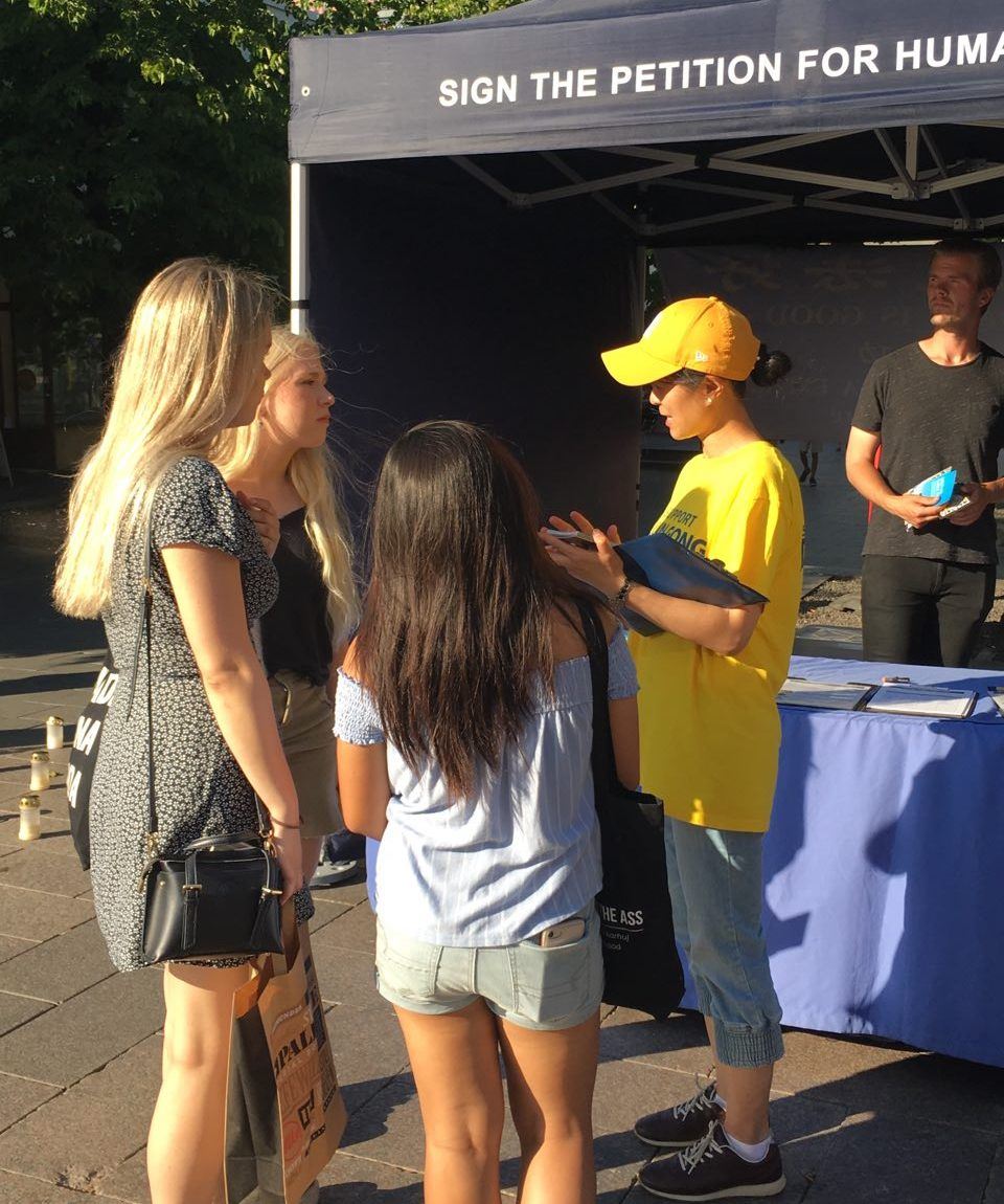 ![]() 图3:芬兰首都市中心,路人驻足听法轮功学员讲真相。 |