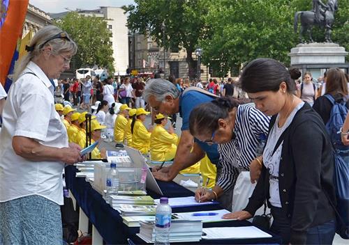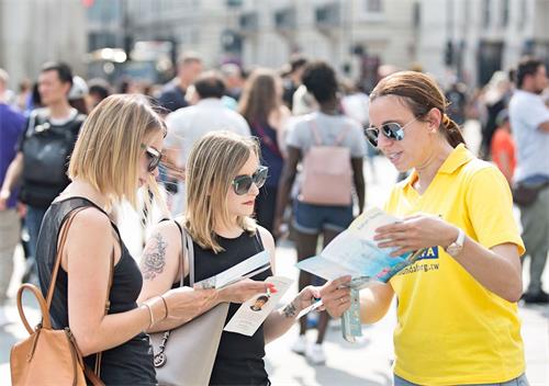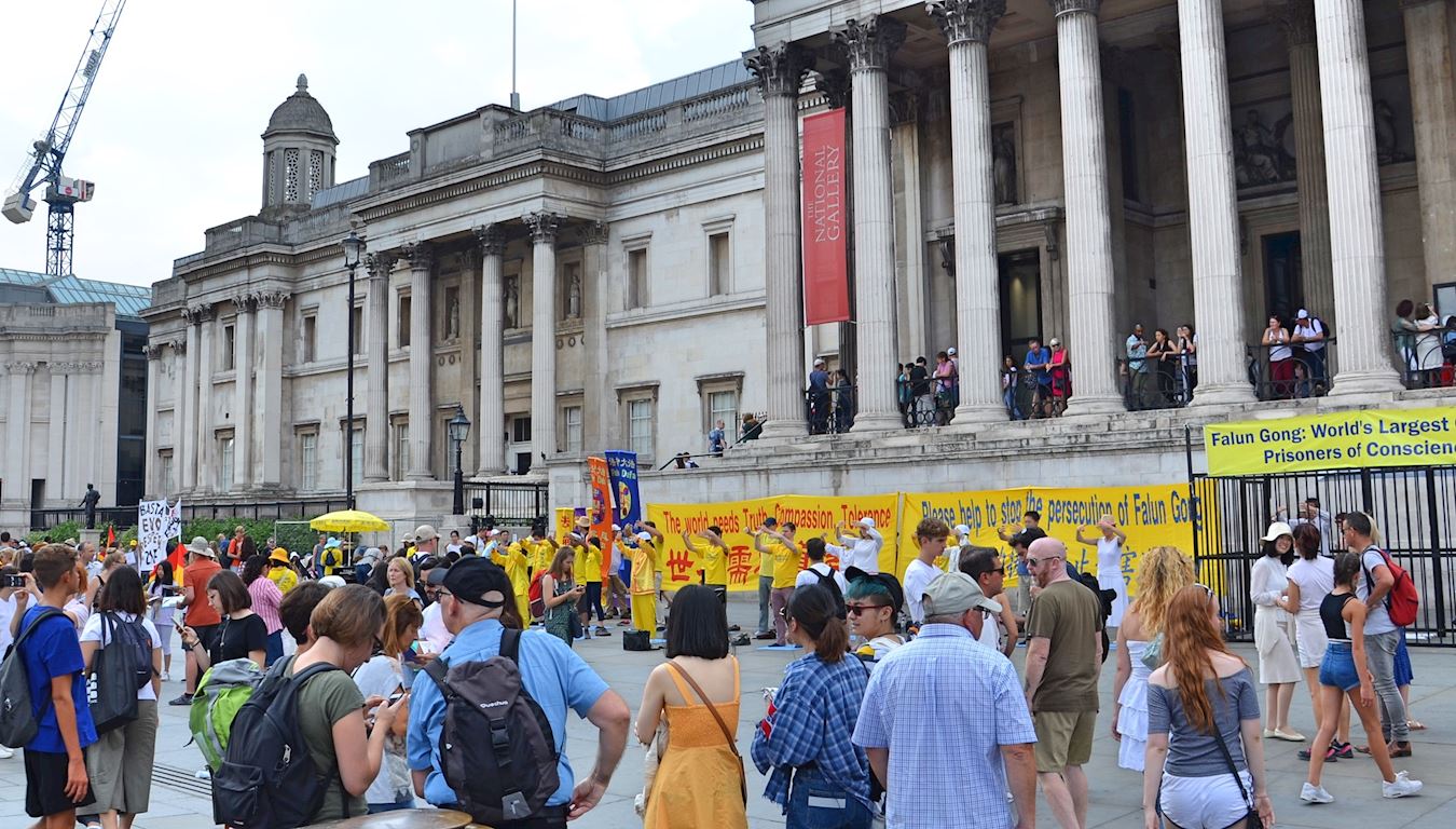 图9:游行之后,英国法轮功学员在特拉法加广场的北平台广场举行讲真相活动。祥和的功法演示吸引许多民众观看,了解真相。