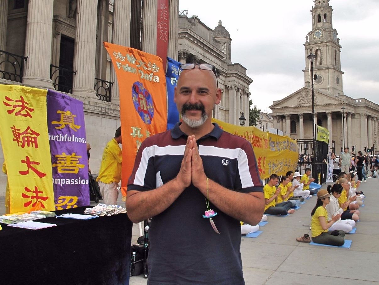 图19:伦敦居民贾迪(Jadi)说他在法轮功这里体会到了预示着希望的正面能量,他说:“真善忍代表着希望,是真理,是慈悲。”