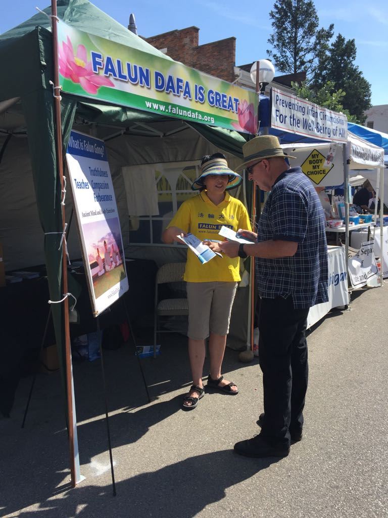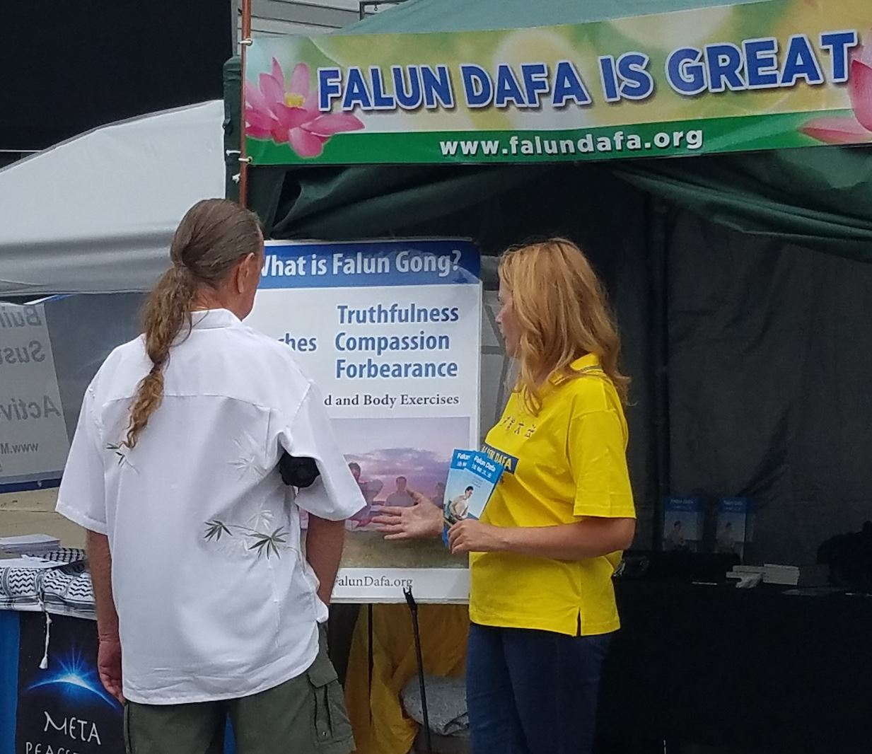 在本次艺术节上,玛丽女士也开始告诉过往的游人,法轮功是什么。她对人们说:“我学法轮功是因为法轮功叫人向善。法轮大法真善忍的原则可以指导人做好人,提高整个社区的道德水平。我愿意把法轮功介绍给大家,是因为法轮大法可以解答很多人心中的疑惑,而且有益于健康,对于我来说,舒缓了我的焦虑心情。”