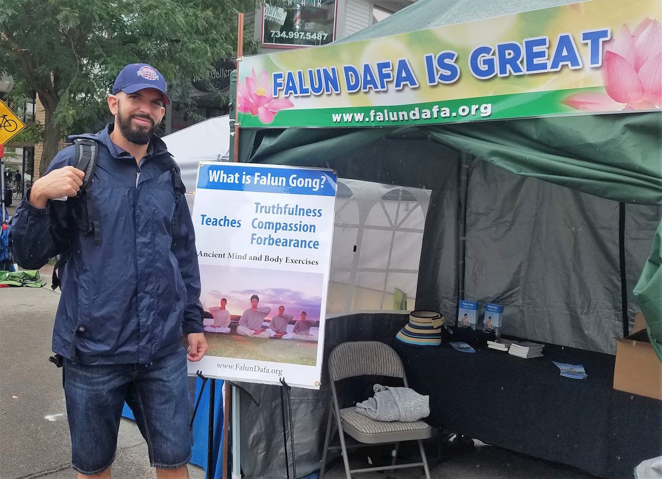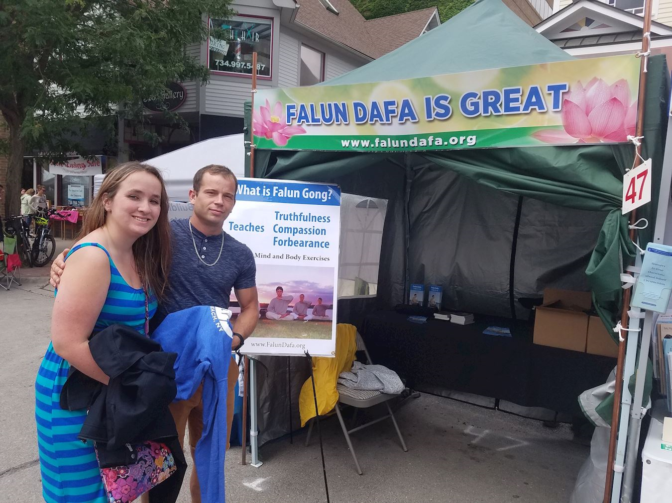 一对年轻的伴侣,朱丽安娜(Julianna)女士和马克(Mark)先生路过法轮功的展位就留住了脚步,朱丽安娜女士是一位小学教师,他们都没有听说过法轮功,听了简短的介绍之后立即表示愿意到安娜堡的炼功点学功。