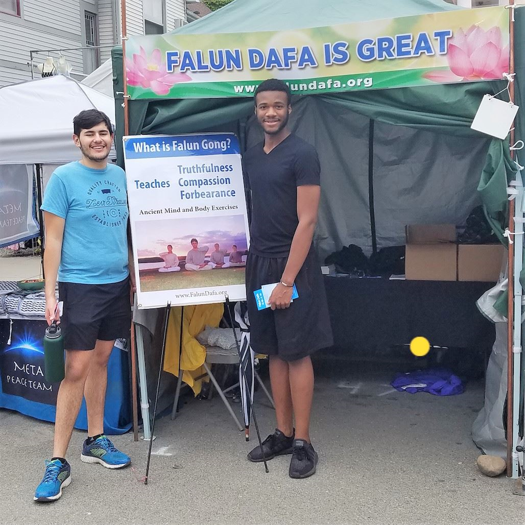 两位青年学子来艺术节闲逛,其中一位看到法轮功的展位就被深深地吸引住了,主动过来听学员介绍法轮功。当得知炼功点就在附近的盖洛普公园(Gallup Park)公园时,他说:“我一定会去公园炼功。”临走前开心的在法轮功展板前留影。
