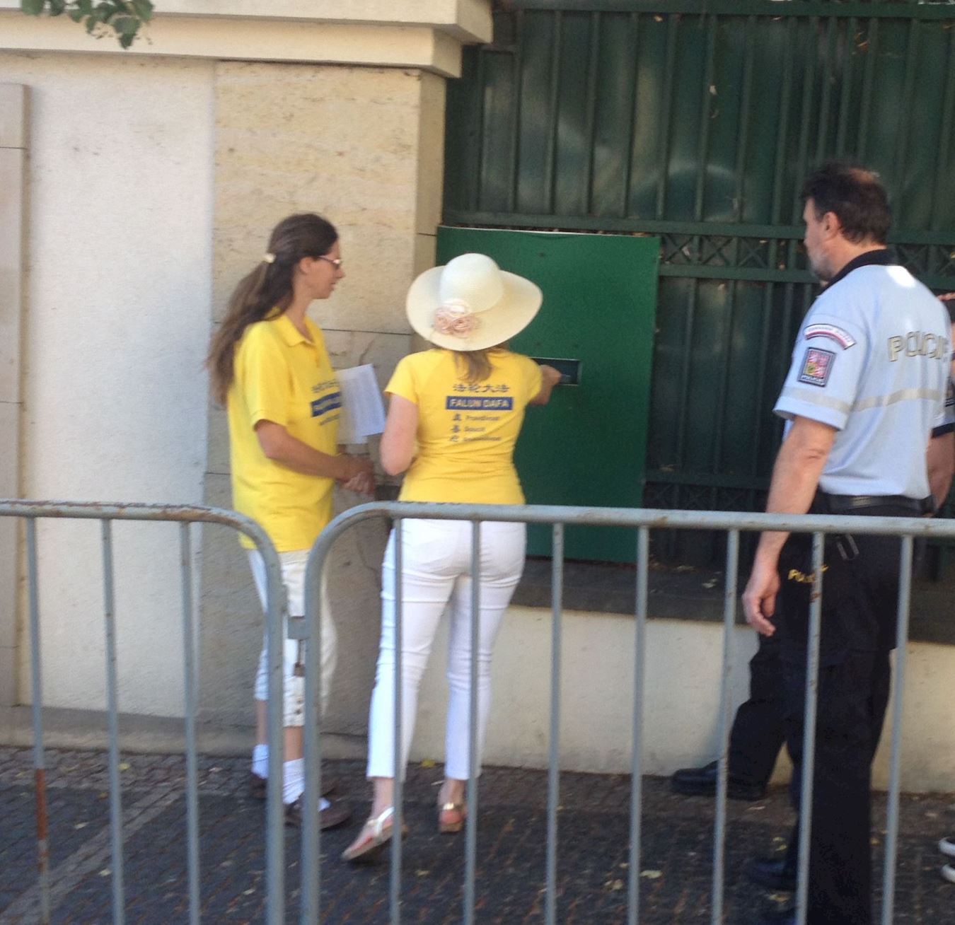 法轮功学员还来到中国驻布拉格大使馆前举行抗议活动。捷克法轮功学会负责人宣读了致中国大使的公开信,谴责中共的迫害,强烈要求释放所有被监禁的法轮功学员,并结束强摘器官的做法。信中强调,“全世界都看到了,这种迫害行为被认为是可耻的,与民主社会的原则是相抵触的。一要结束这种耻辱,使中国得到其他发达民主国家的尊重,中国就必须制止对法轮功的这场迫害。”