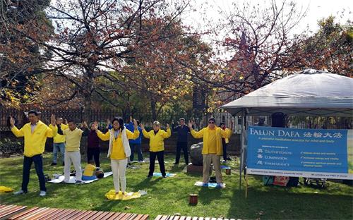 优美的炼功音乐、舒展的炼功动作,及祥和的能量场吸引行人驻足观看、照相、录像、看展板、接传单。有一位女士微笑着对学员说:这个(炼功)音乐太优美了。她说去新西兰时也见到法轮功学员在讲真相,了解了法轮功被中共迫害的情况。她认为这样的和平告诉人真相是很好的方式,“你们做的是很正的事!你们要坚持。”。