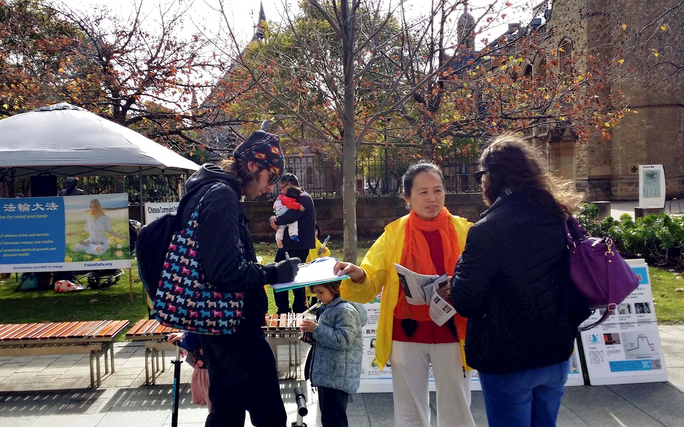 一位阿德莱德大学的年轻女教师路过时也表示,她非常了解法轮功在中国受到迫害的情况,她支持法轮功学员用这种和平的方式告诉人真相,制止迫害。